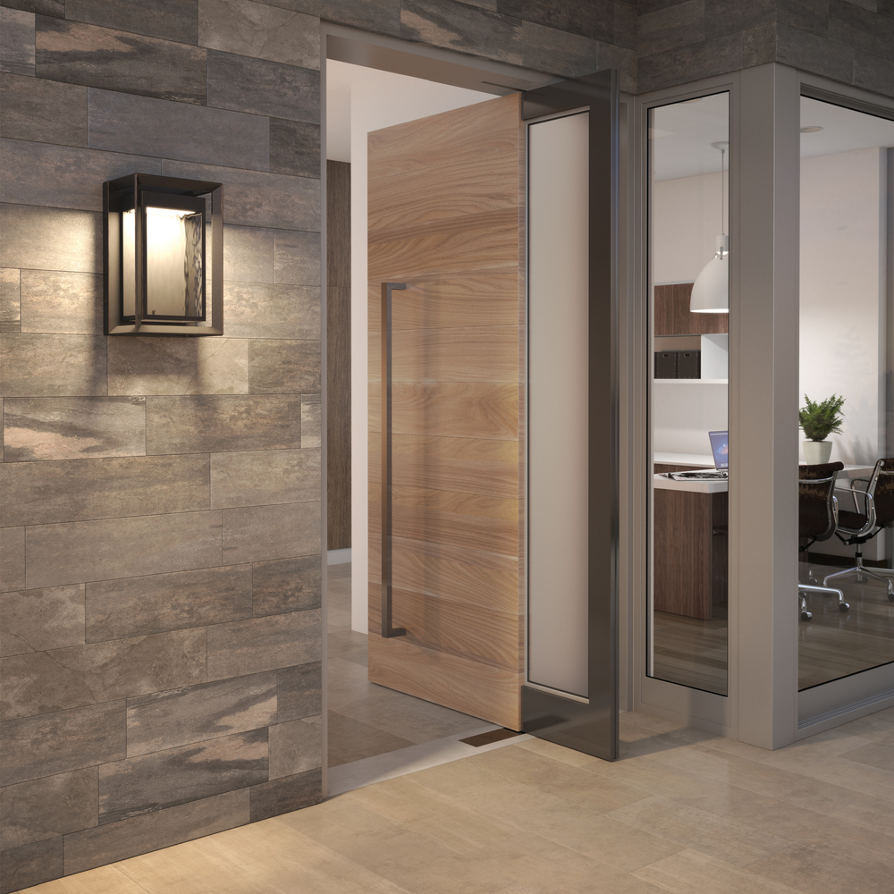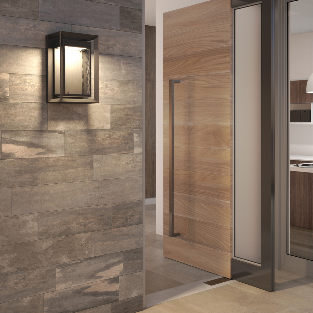 The Urbandale one light outdoor wall fixture in antique bronze creates a warm and inviting welcome presentation for your home's exterior. The Urbandale outdoor collection by has a modern design which features beveled edges achieved with the fine precision of crisp die-cast construction. Both incandescent and LED versions are available, and each offer slightly different aesthetic. The incandescent version is offered in the Antique Bronze finish which nicely contrasts with the Painted Burnished Brass finish on the squared-off candle holders and Clear Seeded glass to subtly obscure the light source. The LED version is offered in an Antique Bronze finish with Clear Water glass.