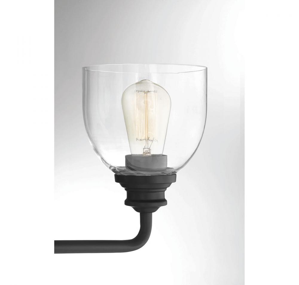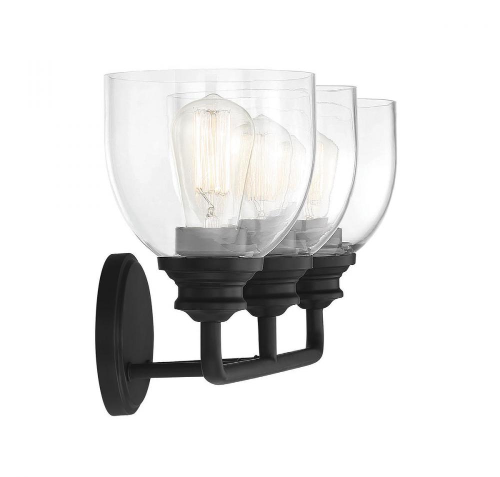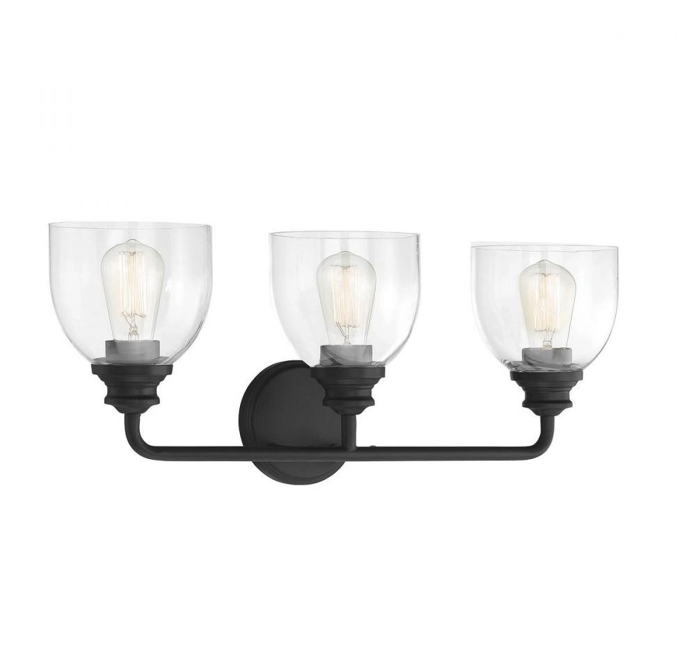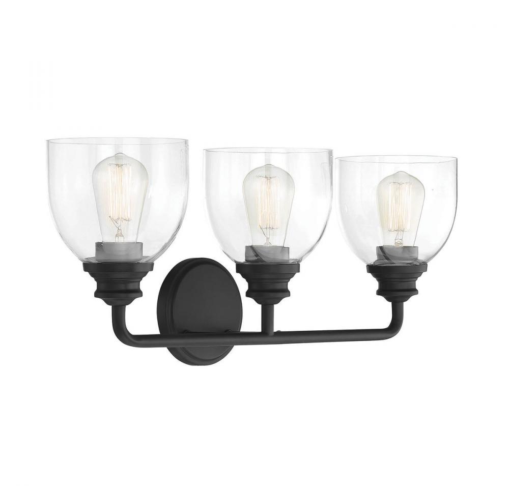 Easily boost the style and the illumination in the bathroom with this Savoy House Vale 3-light bath bar. It is truly a beautiful example of how classic, understated designs have staying power. This bath light has large goblet-shaped shades of clear glass, a slender curved arm and a circular backplate. Its bold black finish makes it perfect for brightening up bathrooms of many sizes and decor styles. This fixture is 24" wide and 9.75" tall. It extends 7.25" from the wall. Uses 3 standard size bulbs of up to 60 watts each (not included).