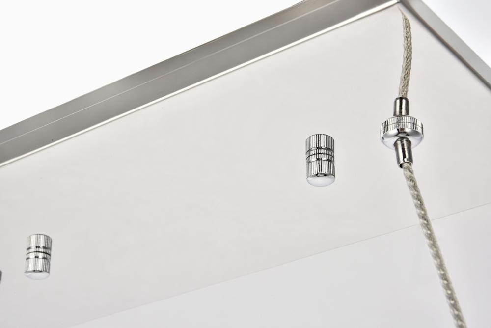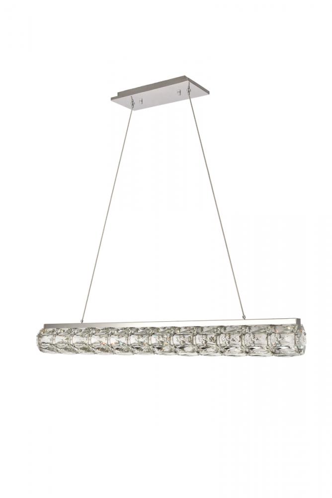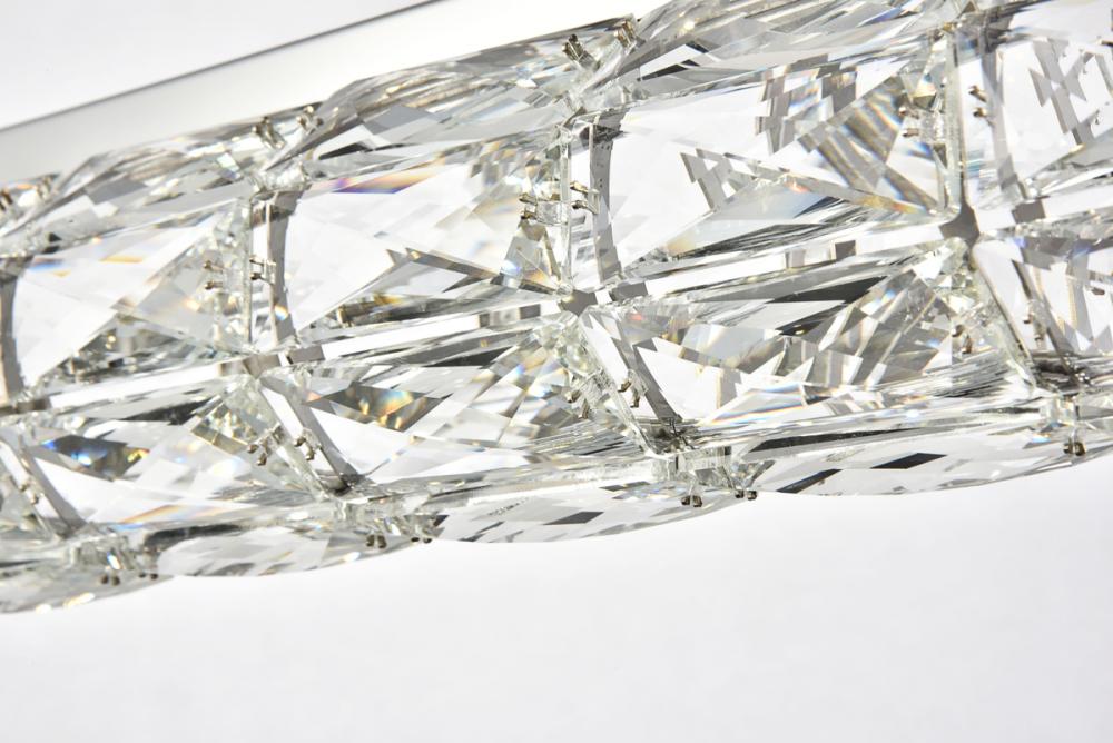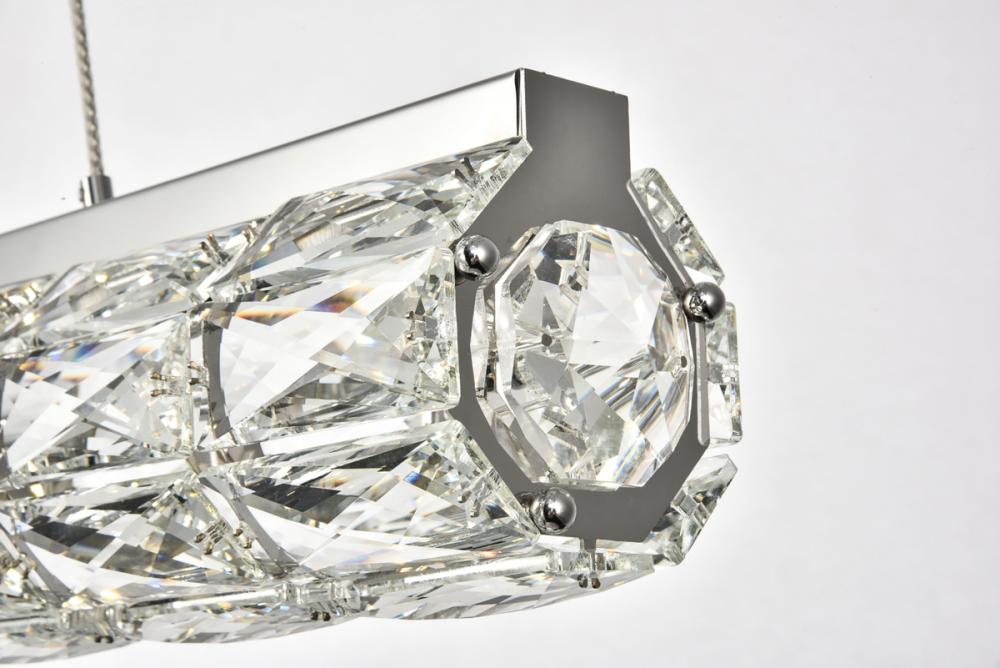 Valetta hanging fixtures dress up a living room, dining room, or bedroom without overwhelming the surrounding décor. This collection features an octagonal tube-shaped stainless-steel frame that’s covered almost entirely with shining rectangular royal-cut clear crystals. Faceted crystal octagonal crystals cover both ends as a charming finishing touch. A rectangular mounting plate is connected to the frame by slender cables that keep everything secure. A sleek chrome finish completes this modern look. Available in three different lengths.