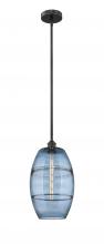 The Vas Series is meticulously handcrafted, showcasing exquisite glass band detailing. These bands are the result of a complex and delicate glassblowing technique, making each pendant truly one-of-a-kind. While the exterior of the glass shade has a sleek a