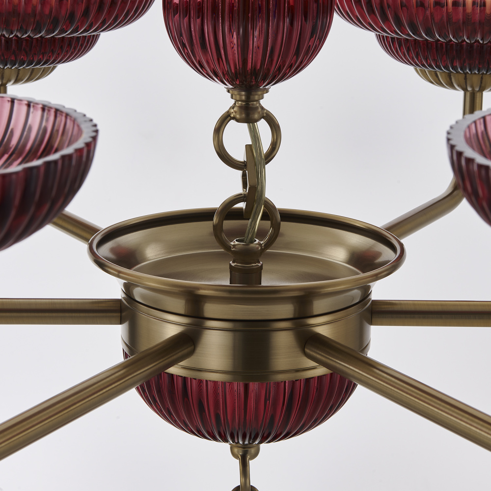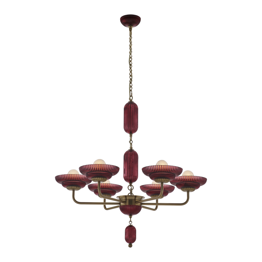 Infuse your interiors with dramatic elegance and retro charm with the stunning Verde collection, featuring a True Satin Brass (STB) finish with your choice of either fluted green or magenta glass. Each richly textured glass dish cradles a glowing orb bulb, casting a warm, inviting light and creating a play of color and shadow. The overall composition and decorative chain highlight an exquisite balance between vintage glamour and modern sophistication, perfect for dining rooms, grand entryways, or boutique hospitality settings. Whether illuminated or admired unlit, this collection captivates with its bold color and refined craftsmanship.