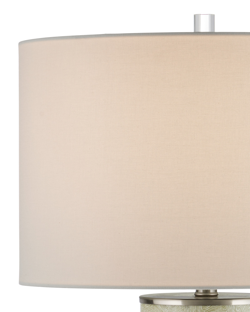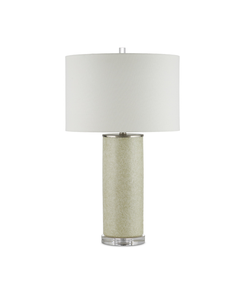 The Verdure Cylinder Table Lamp has a sophisticated swirling green and white pattern on its surface, which recedes to a lovely stippled effect when seen from far away. The interlocking amoeba shapes only appear when one draws near the green table lamp made of porcelain. The columnar body that sits atop an optic crystal base is capped with a metal plate in a satin nickel finish. The optic crystal finial echoes the sleekness of the lamp's body.
