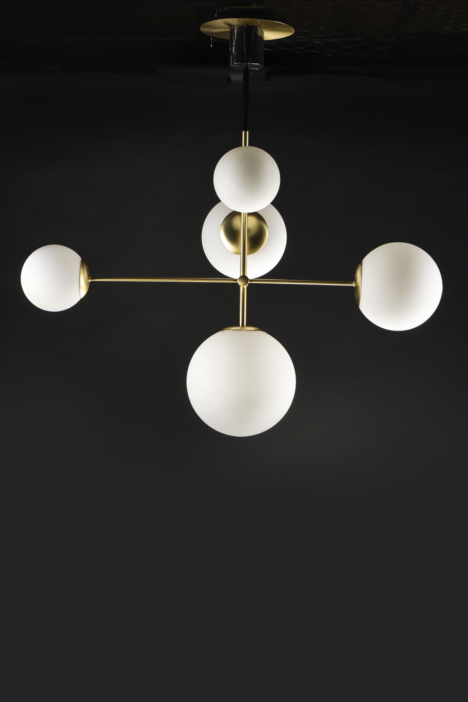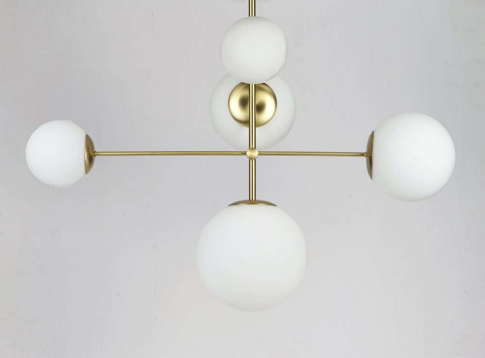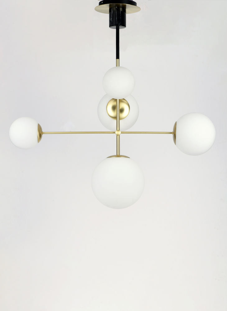 Inspired by both Mid Century Modern and Scandinavian Contemporary this collection spans a large breadth of today's interior design. Straight tubing finished in Satin Brass supports hand blown Satin White cased glass globes. Black accents of metal and B