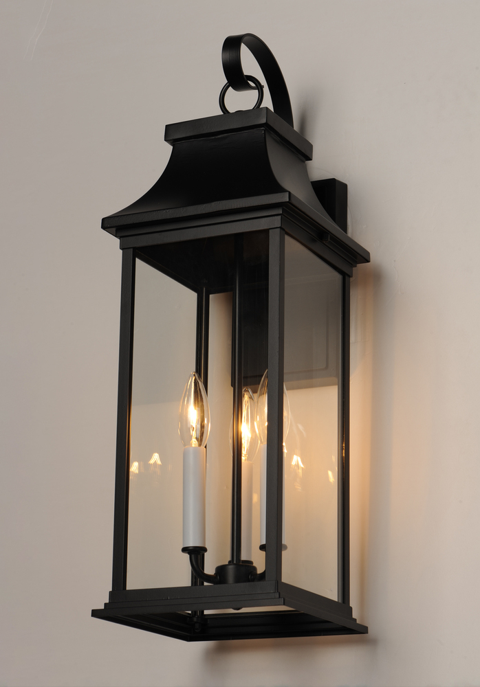 Inspired by classic coach gas lanterns, the Vicksburg collection features die-cast aluminum construction finished in Black with Clear glass. The candle sleeves are done in a contrasting off-white finish to add dimension to the lantern. Available in numerou