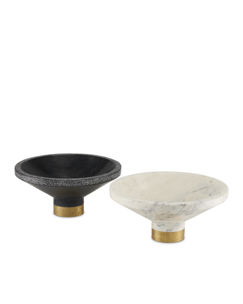 The Vincent Black Marble Bowl is made of solid marble with a brass-claded base and chiseled details on the edges, which bring it added texture. The base also has a stippled surface achieved when artisans chisel the surfaces. Because this black decorative bowl is made of a natural material, slight variations will exist from piece to piece.