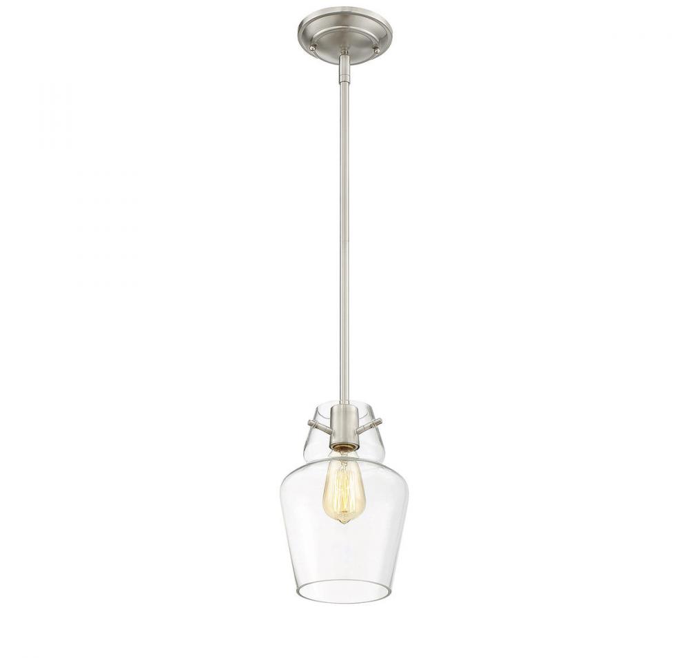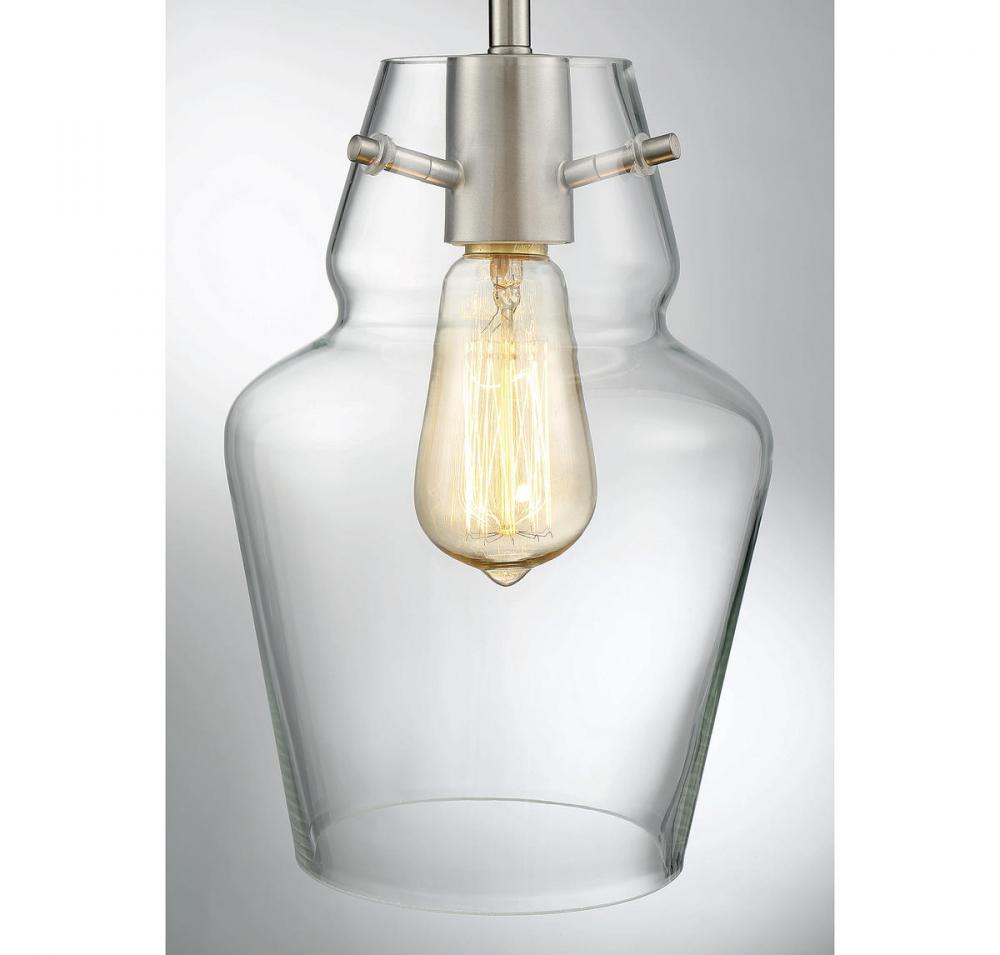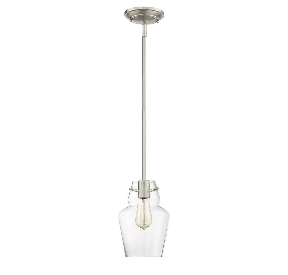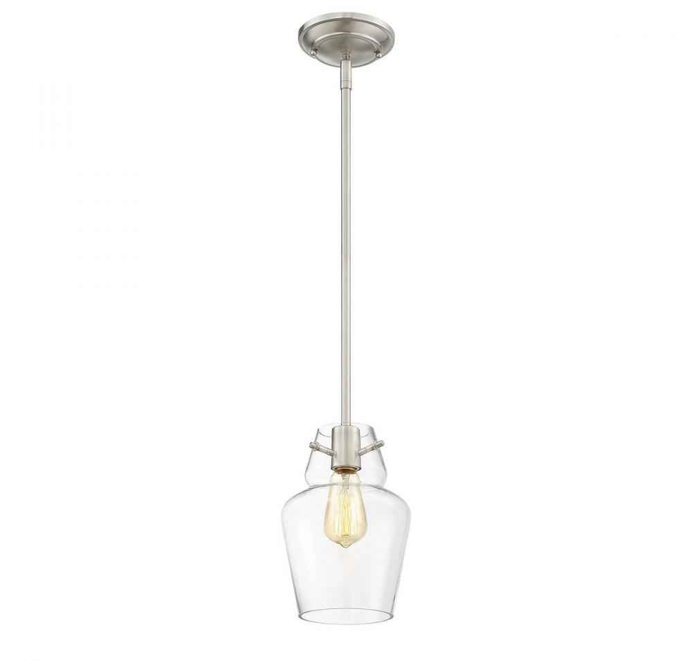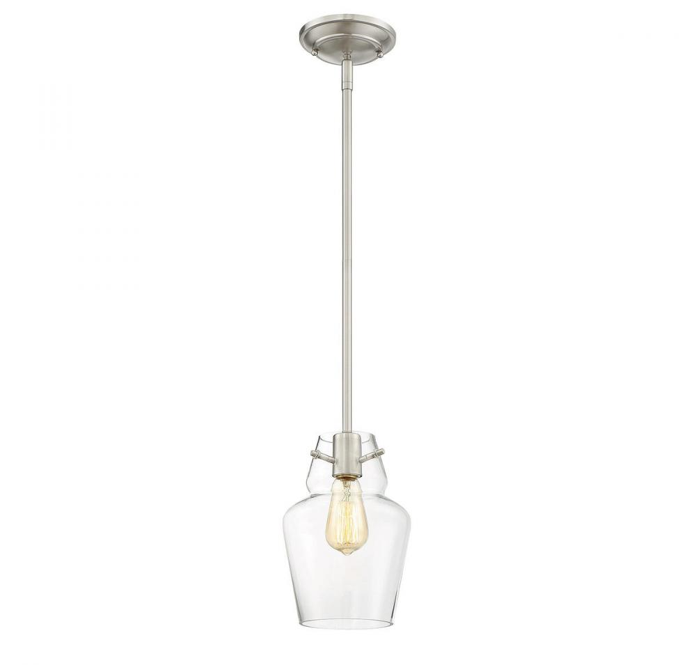 This Savoy House mini pendant has streamlined, classic style! The understated bulb socket has a rich, shining satin nickel finish and the frame holds a curved, apothecary jar-shaped shade made of pristine clear glass. One 60W standard size bulb allows ample illumination through the clear glass and using a stylized bulb will add to the vintage charm. Overall, it has a timeless, sophisticated appearance. The pendant is 7" wide, 10.5" high and has a 20" to 39" adjustable hanging height. It’s a perfect size to hang alone, in pairs or in groupings and it’s sure to bring vintage appeal to your dining room, kitchen, living room, bedroom, hallway, family room, office or stairway.