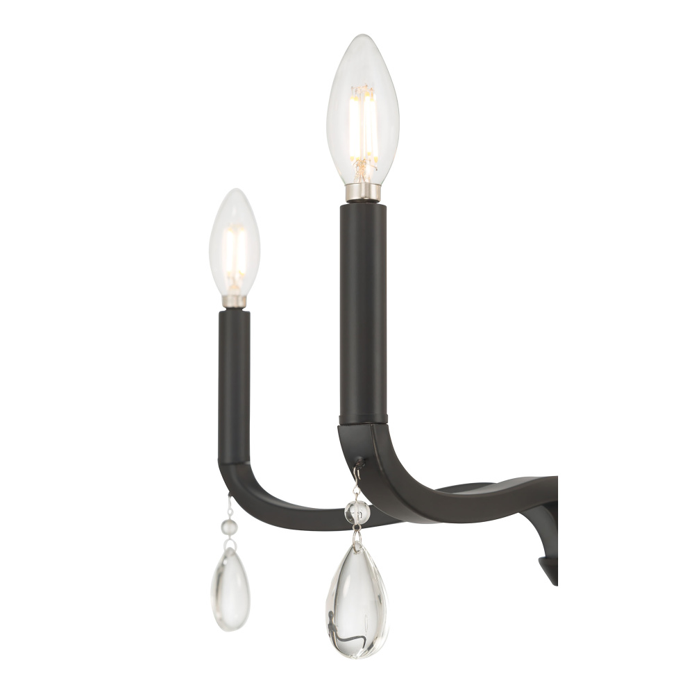 Understated opulence emanates with dazzling panache from the Viremont Collection of candle-style chandelier lighting. Gently curved arms are punctuated with sparkling glass teardrop pendants perfectly positioned to catch the light and blending old-world charm with modern simplicity. Available as 4, 6, or 8-light chandeliers, these shimmering fixtures are finished in either vintage brass or matte black.