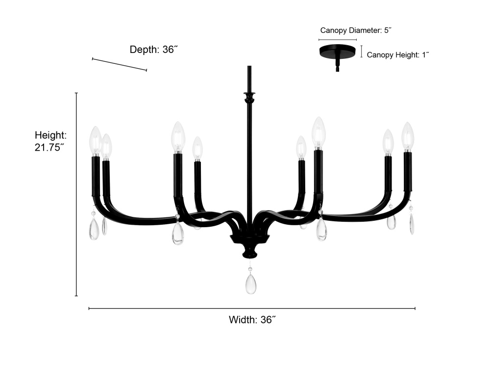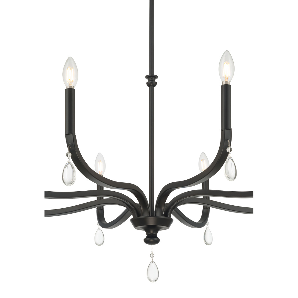 Understated opulence emanates with dazzling panache from the Viremont Collection of candle-style chandelier lighting. Gently curved arms are punctuated with sparkling glass teardrop pendants perfectly positioned to catch the light and blending old-world charm with modern simplicity. Available as 4, 6, or 8-light chandeliers, these shimmering fixtures are finished in either vintage brass or matte black.