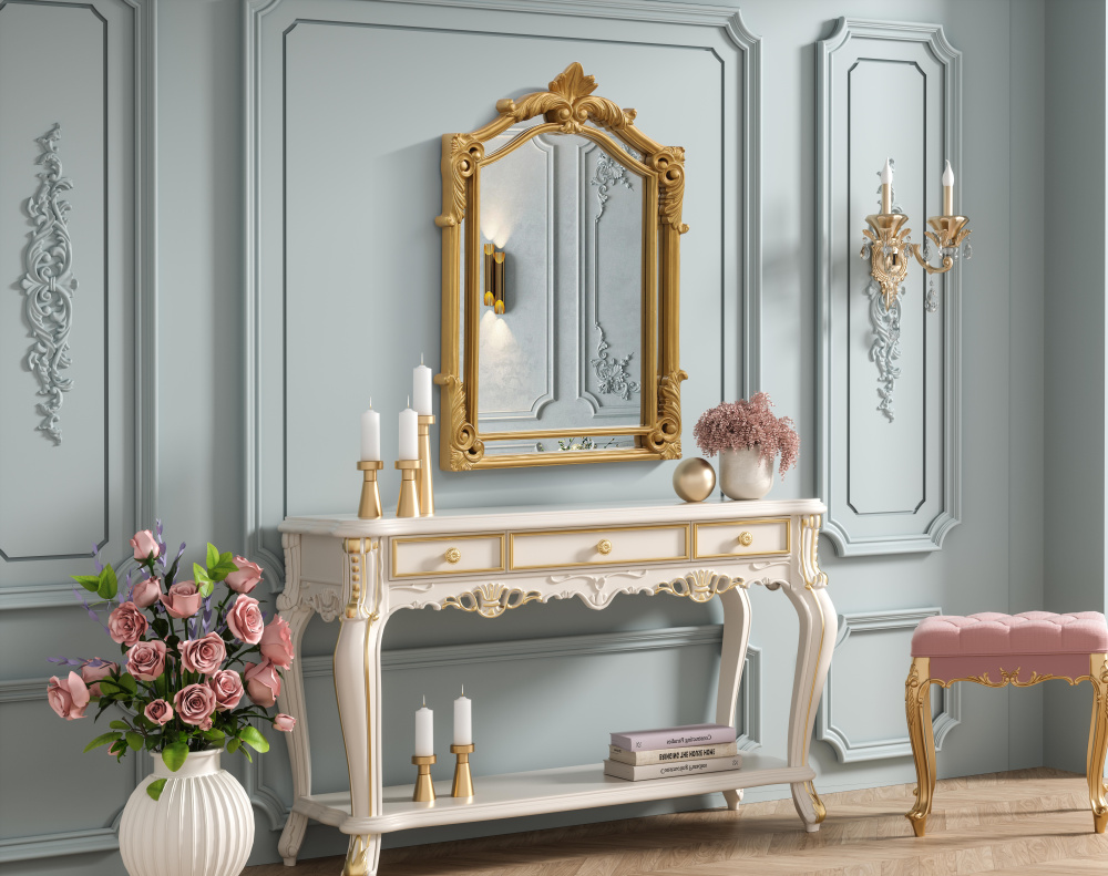 With its ornate crest and intricate corner embellishments, this mirror transforms any space into a masterpiece of classic décor
