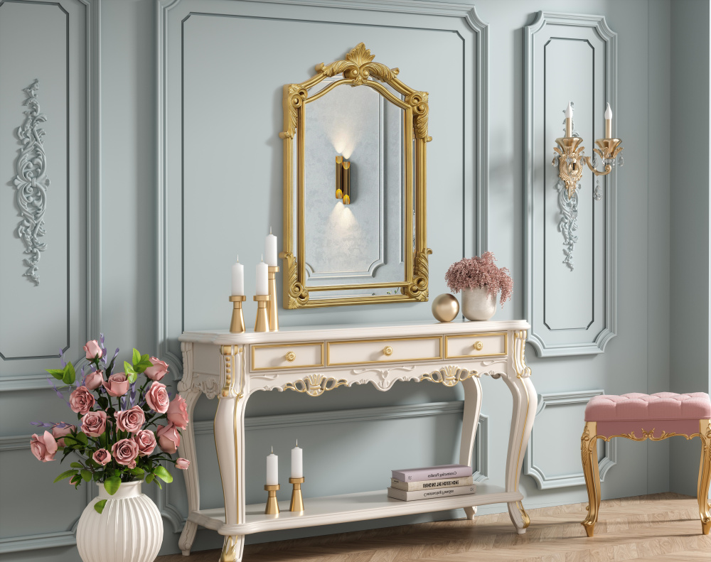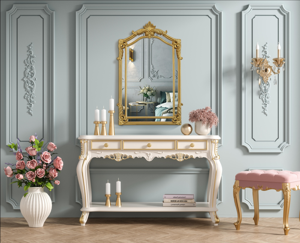 With its ornate crest and intricate corner embellishments, this mirror transforms any space into a masterpiece of classic décor