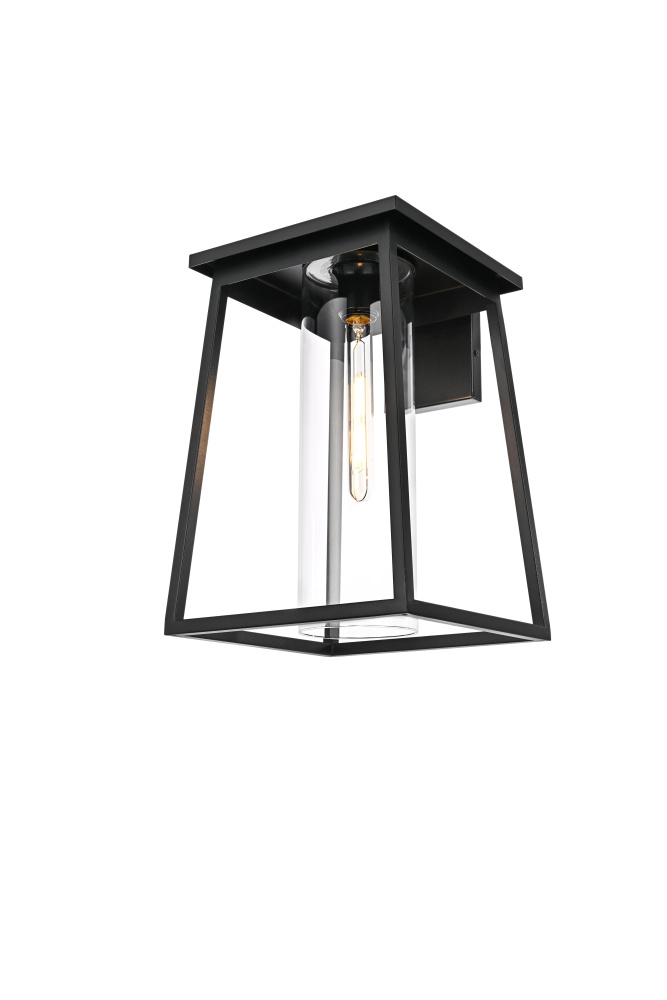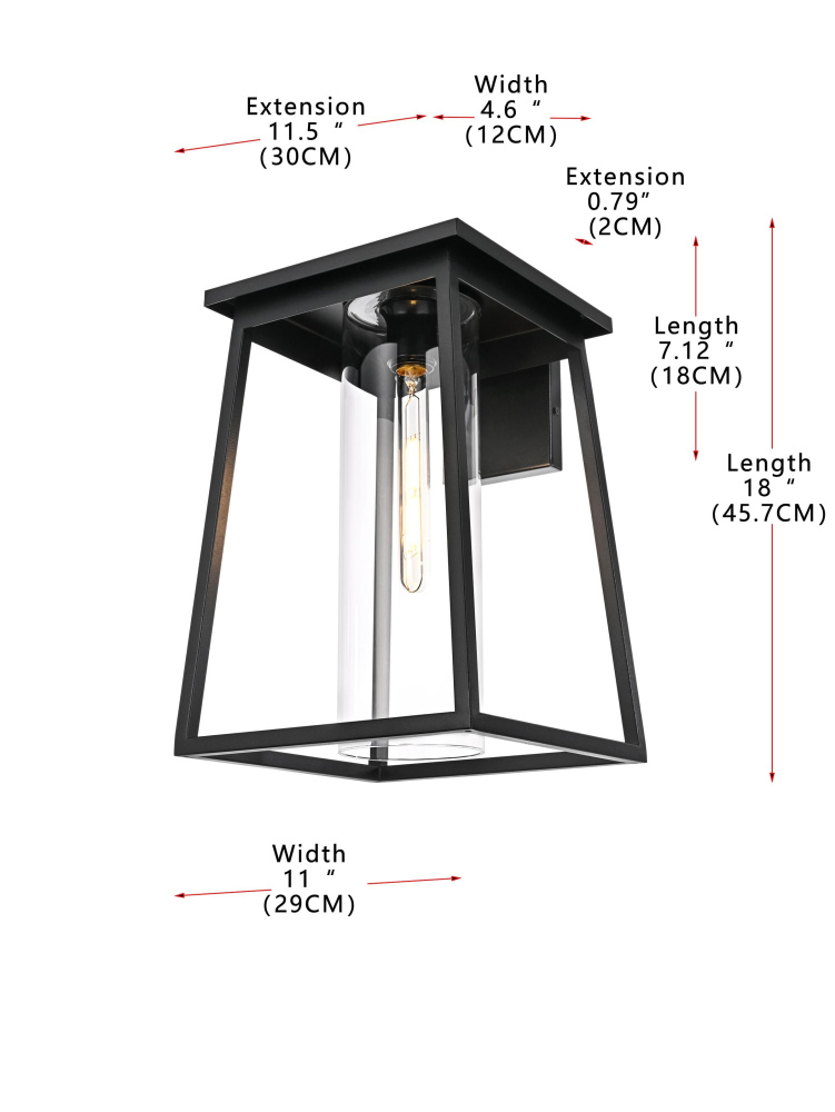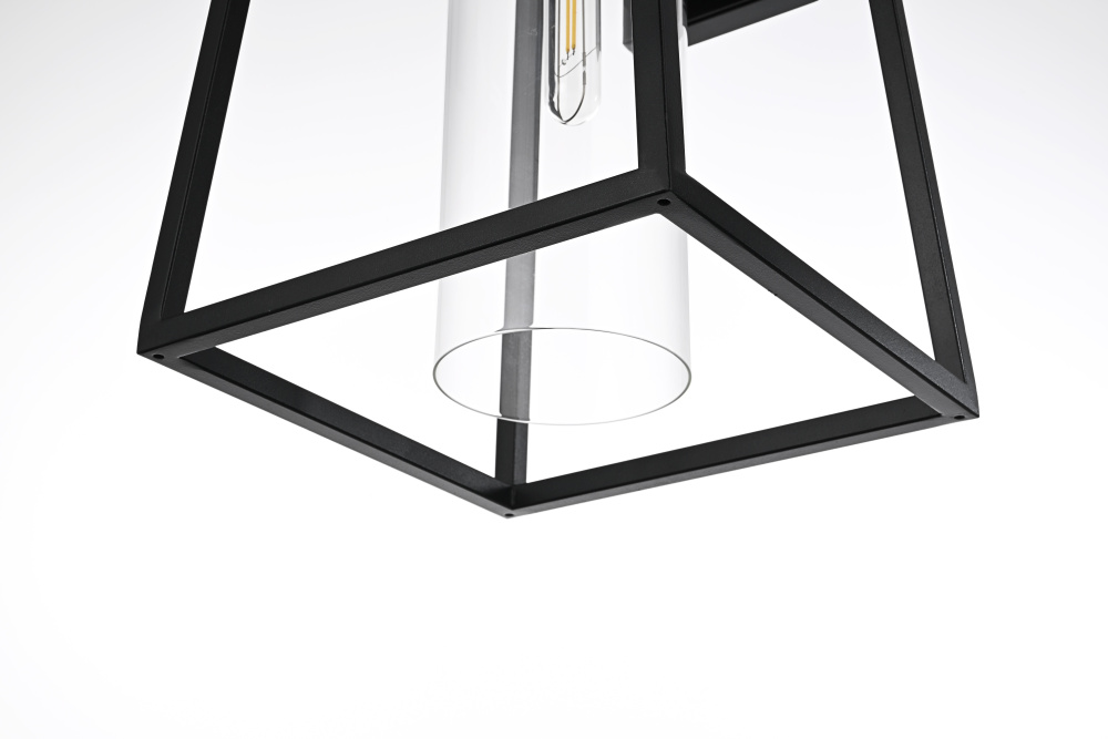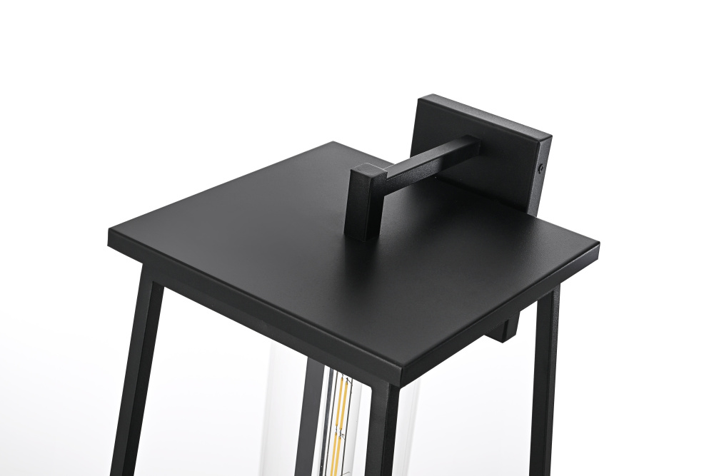 This outdoor wall sconce offers a seamless combination of clean lines and modern styling that makes it an ideal choice for adding character and warmth to any exterior. Made of durable iron with clear glass panels, it frames the light beautifully, allowing it to illuminate your home's exterior with a welcoming glow. The trapezoid frame, open bottom, and minimalist silhouette contribute to a contemporary look that blends well with both modern and transitional outdoor settings. The E26 socket accommodates a wide variety of bulbs, making it customizable to fit your lighting needs, while the triangular loop accent on top adds a charming architectural detail. Perfect for patios, porches, or entryways, this sconce enhances your home's curb appeal and provides practical lighting for any outdoor space.