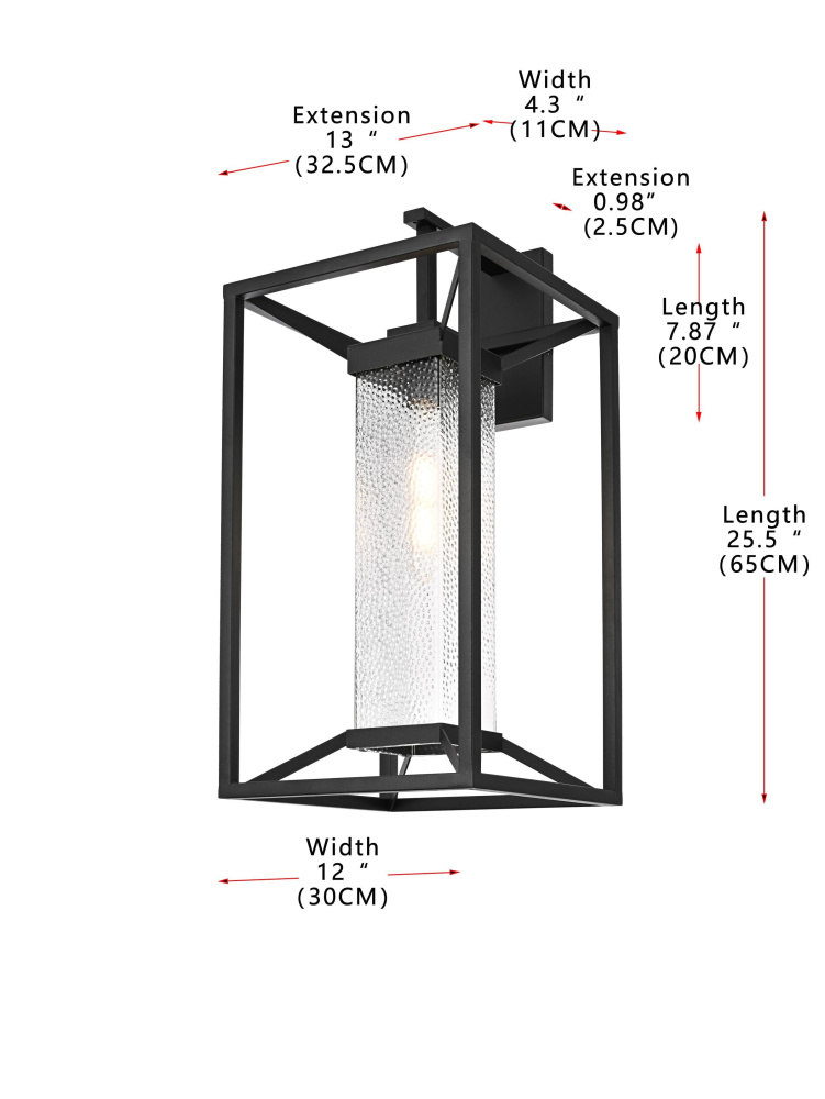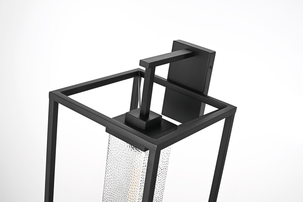This outdoor wall sconce blends modern simplicity with timeless charm. The sturdy iron frame is designed in a geometric shape, beautifully housing the clear seeded glass that allows the warm glow of the light to shine through. The clear seeded glass adds texture to the illumination, creating an inviting and sophisticated glow that transforms the exterior of your home. With an E26 socket base that easily accommodates standard bulbs, this fixture not only provides style but also high functionality. Whether flanking your front door or lighting up your patio, this sconce elevates your outdoor space with a crisp, contemporary look that is both durable and refined.