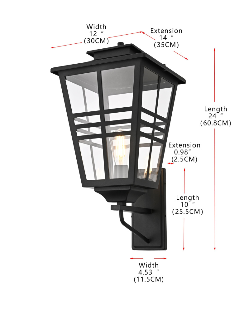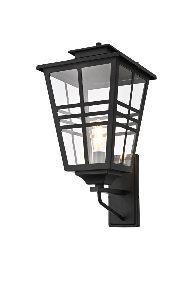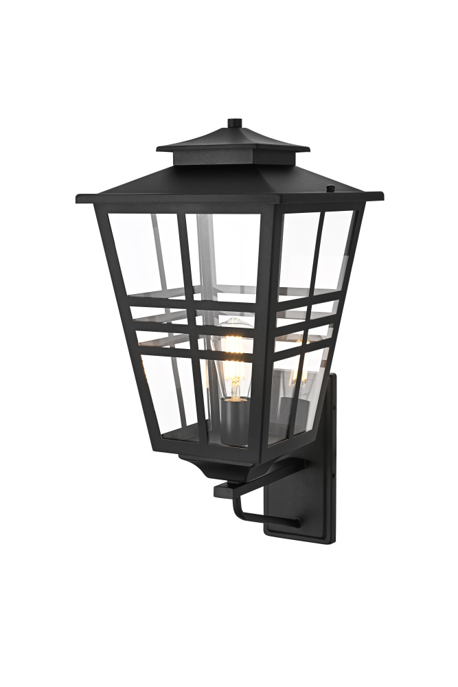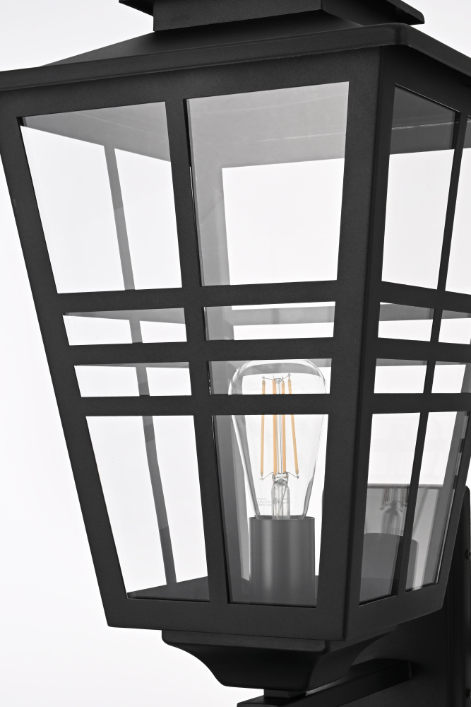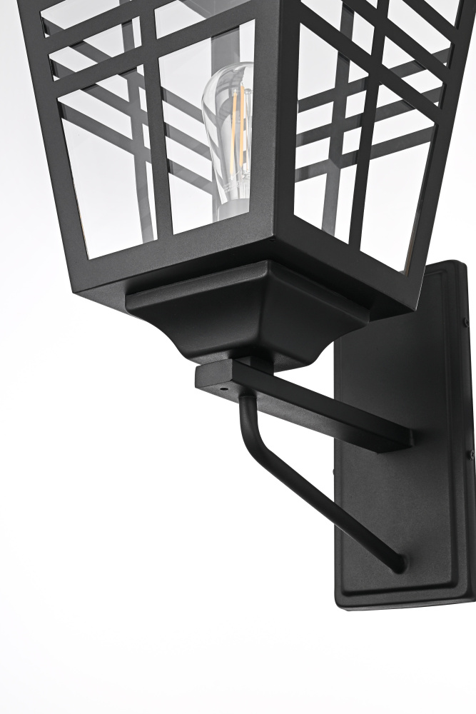 Add a welcoming glow to your outdoor spaces with this timeless lantern-style wall sconce. Inspired by traditional craftsman designs, this sconce features a durable iron frame paired with clear glass panels to provide excellent illumination. The matte black finish complements any exterior decor, adding a stylish yet functional touch to your entryway, patio, or garage. Each bulb socket is rated for up to 60 watts, providing ample illumination to brighten entryways, patios, and porches. The grid detailing on the clear glass panels enhances the overall aesthetic while delivering a bright and comforting glow. Built to withstand outdoor elements, this wall sconce is both practical and visually appealing, perfect for illuminating your home's exterior with style and efficiency.