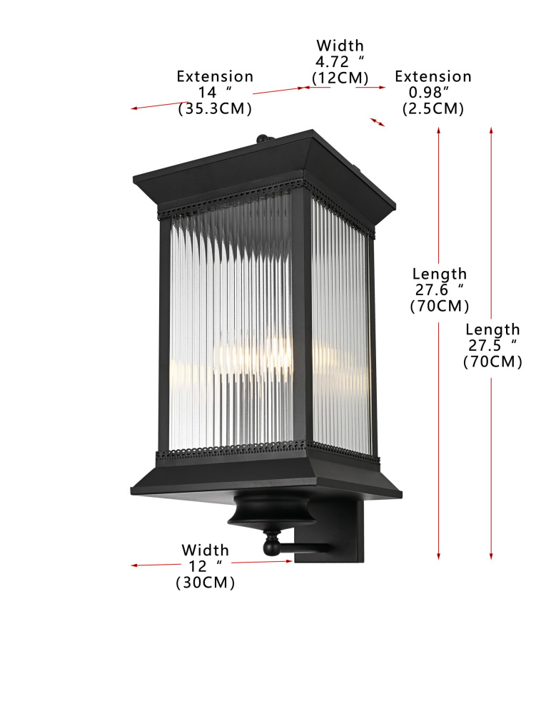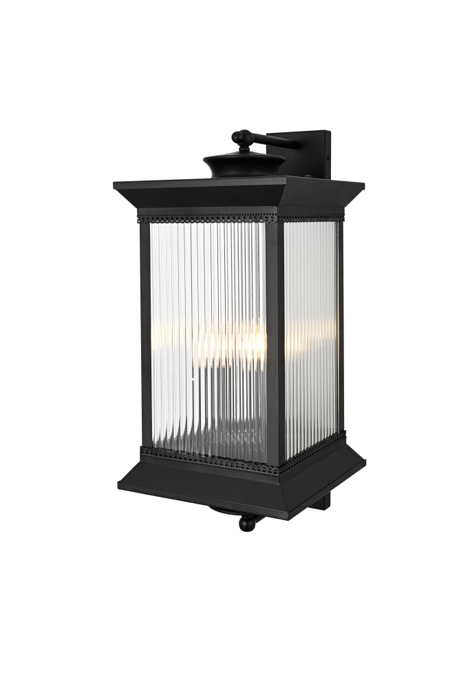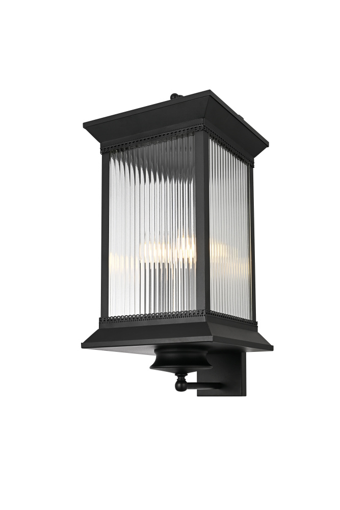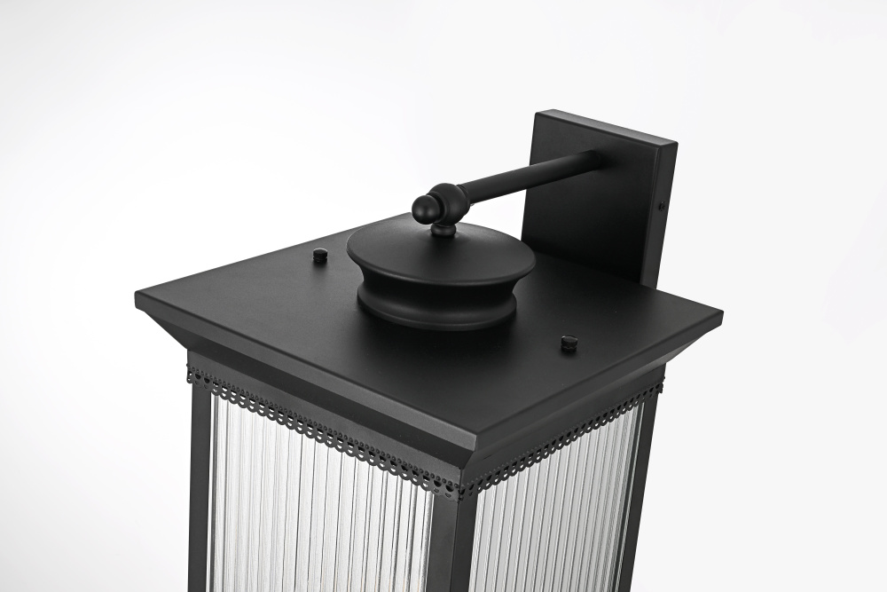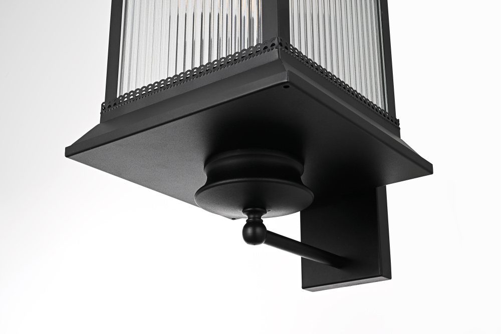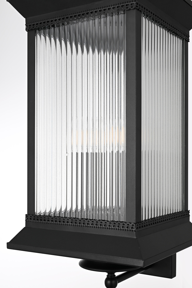 Enhance your home's exterior with this thoughtfully designed outdoor wall sconce that combines timeless character with modern functionality. The wall sconce features a robust iron construction that offers both durability and a bold architectural presence, making it a charming addition to your entryway or patio. Its signature black finish contrasts beautifully with the intricate ribbed glass panels, which cast enchanting, diffused illumination that adds a touch of warmth to any evening. The decorative accents along the trim exude a sense of sophistication, while the robust shape lends itself to a versatile range of outdoor styles—from classic to contemporary. This wall sconce serves as both a functional light source and a statement piece that complements your outdoor space with unique artistr