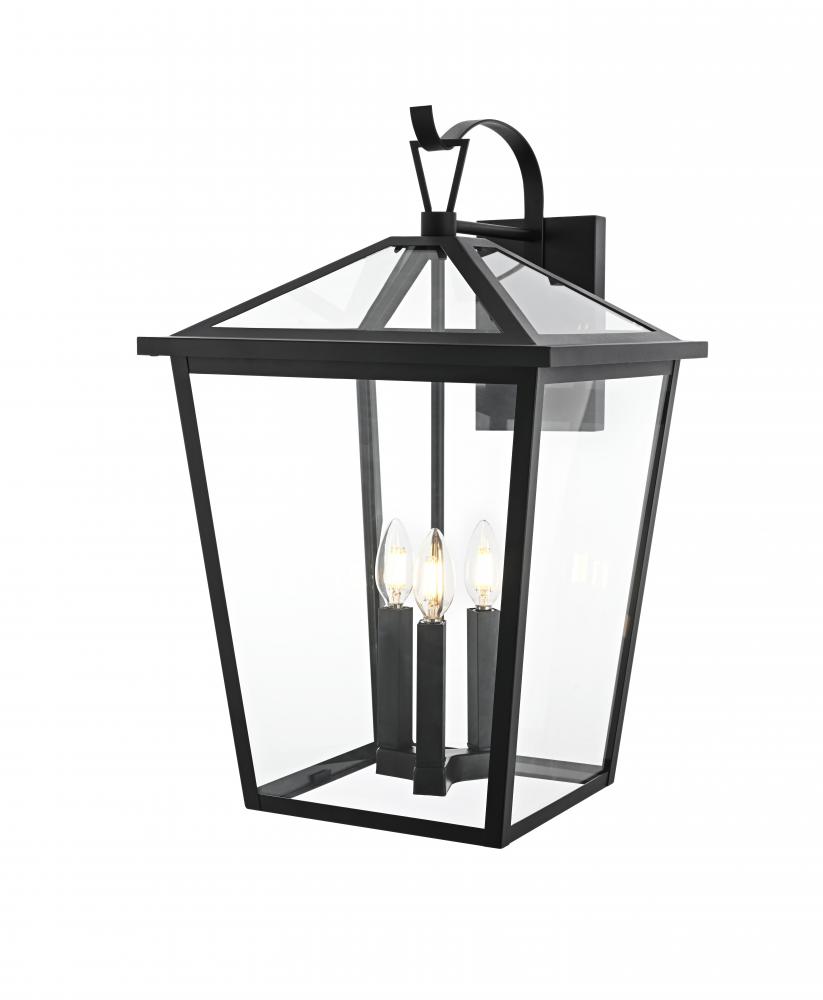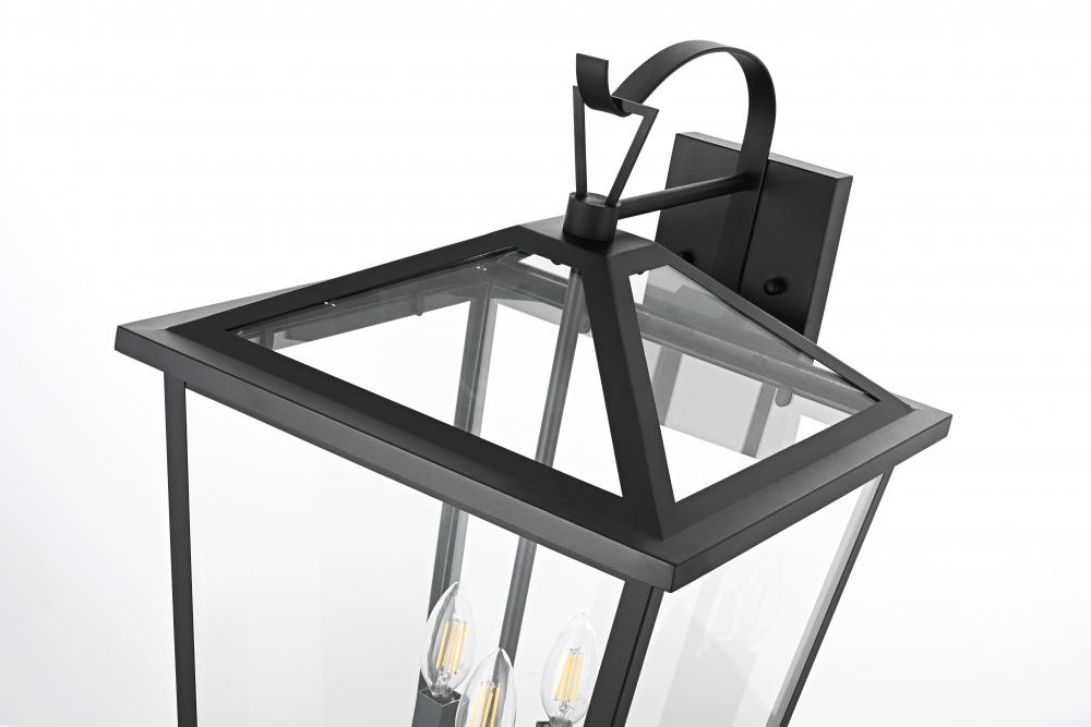 This outdoor wall sconce is a beautiful embodiment of modern and classic design that perfectly complements any exterior home setting. Constructed from sturdy iron and clear glass, the sconce combines sharp architectural lines with a timeless lantern style, resulting in a statement fixture that enhances curb appeal. The angular matte black frame, topped by a stylish triangular loop, embraces an open, trapezoid-shaped structure with clear glass panels that reveal three E12 candelabra sockets. These sockets provide the ideal opportunity to incorporate flame-shaped bulbs for a warm, welcoming ambiance. The open bottom design not only adds a touch of convenience for bulb replacement but also emphasizes the light's natural downward glow, making this sconce both practical and visually captivating. This piece is perfect for flanking a front door, lining a pathway, or accentuating any outdoor living area.