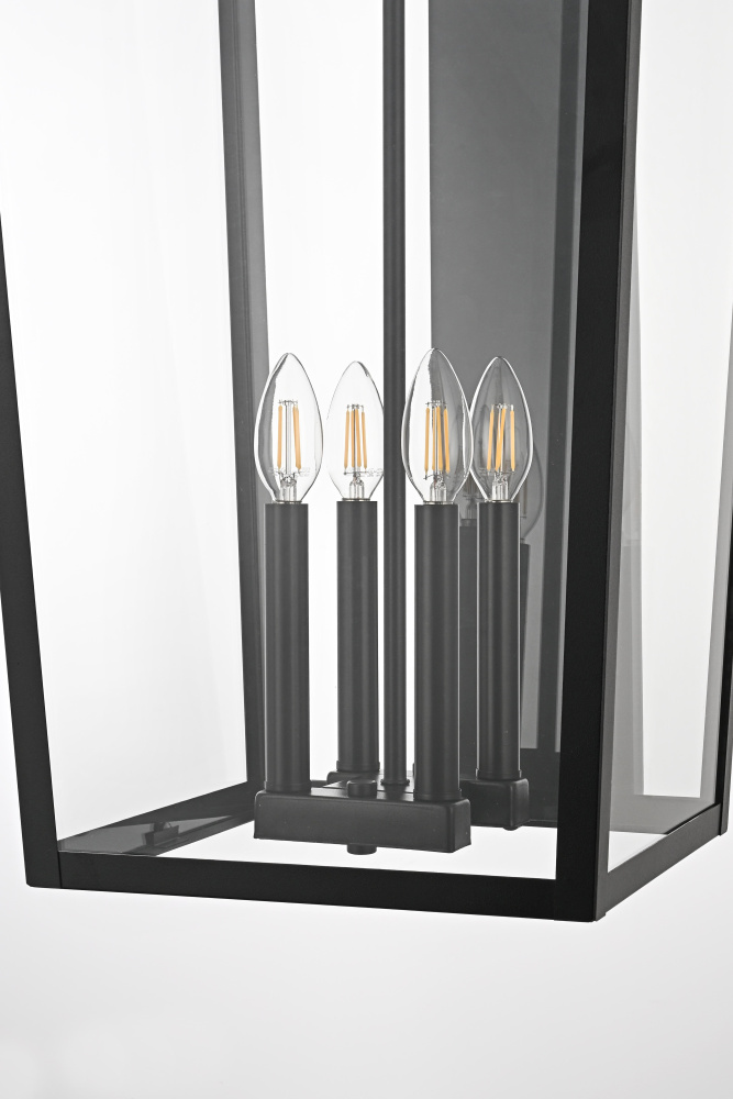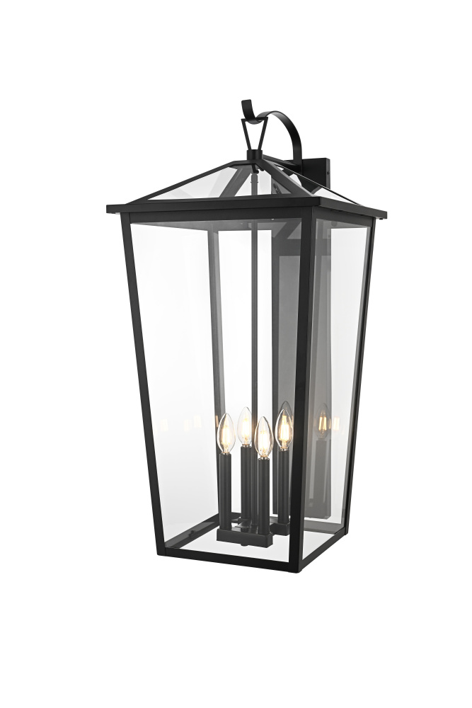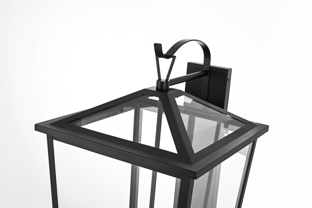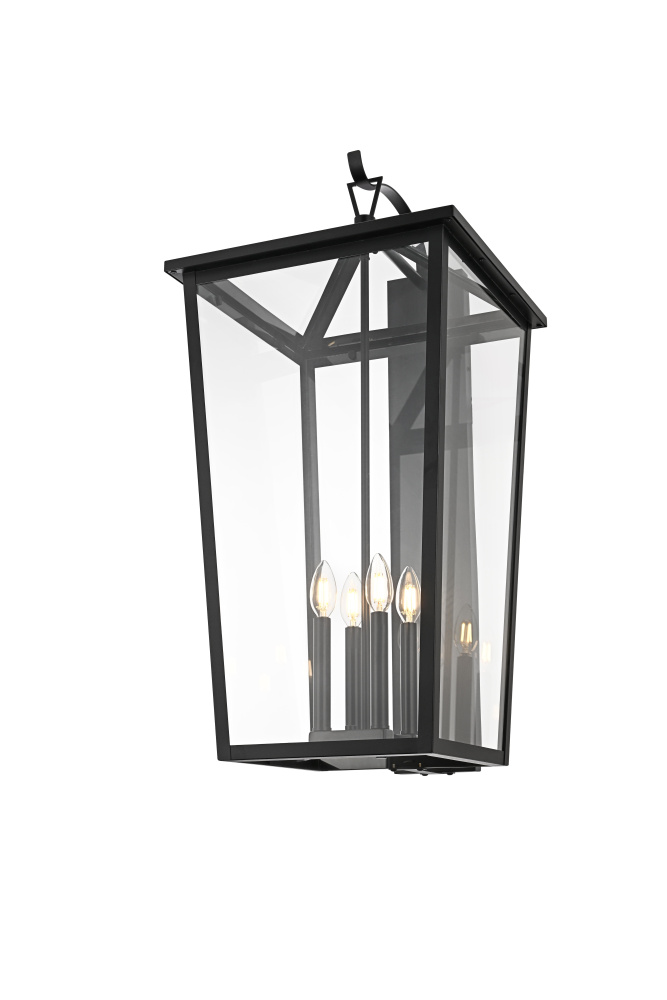This outdoor wall sconce is a beautiful embodiment of modern and classic design that perfectly complements any exterior home setting. Constructed from sturdy iron and clear glass, the sconce combines sharp architectural lines with a timeless lantern style, resulting in a statement fixture that enhances curb appeal. The angular matte black frame, topped by a stylish triangular loop, embraces an open, trapezoid-shaped structure with clear glass panels that reveal four E12 candelabra sockets. These sockets provide the ideal opportunity to incorporate flame-shaped bulbs for a warm, welcoming ambiance. The open bottom design not only adds a touch of convenience for bulb replacement but also emphasizes the light's natural downward glow, making this sconce both practical and visually captivating. This piece is perfect for flanking a front door, lining a pathway, or accentuating any outdoor living area.
