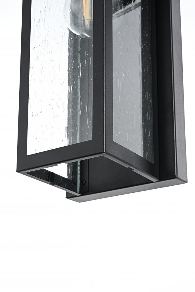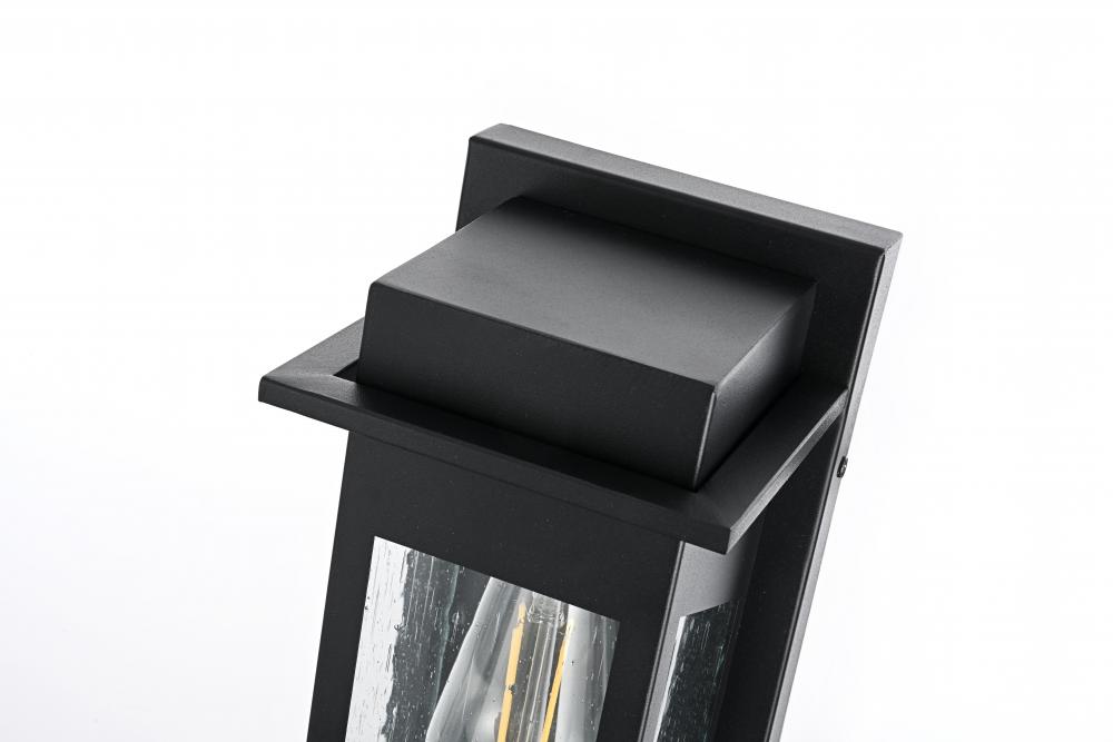This outdoor wall sconce boasts a stunning combination of iron and seeded glass to create a modern and timeless appeal for your home's exterior. The sturdy iron frame envelops clear, textured glass panels, giving off a warm and inviting glow. The geometric pattern adds visual interest and sophistication, while the E26 socket allows you to pair it with a vintage-style bulb for that perfect accent lighting. This light effortlessly blends with a variety of styles, enhancing the charm of any outdoor space—from porches and patios to entryways. It’s the perfect piece to transform your exterior with a soft, ambient glow while showcasing an eye-catching architectural silhouette.