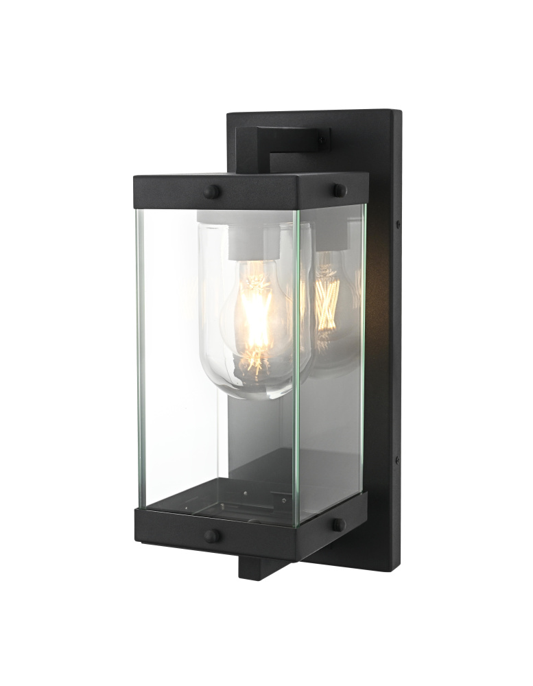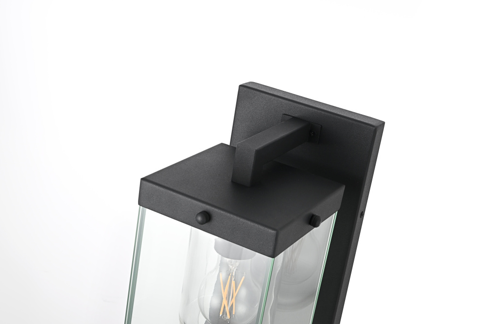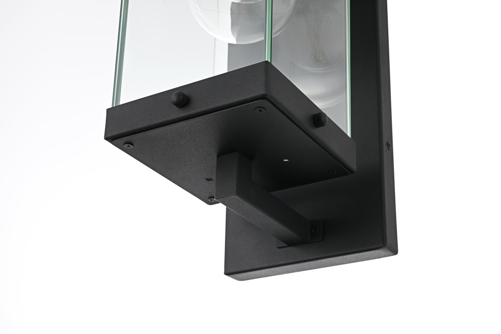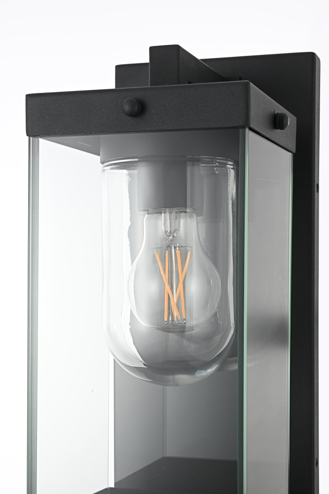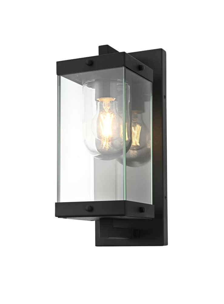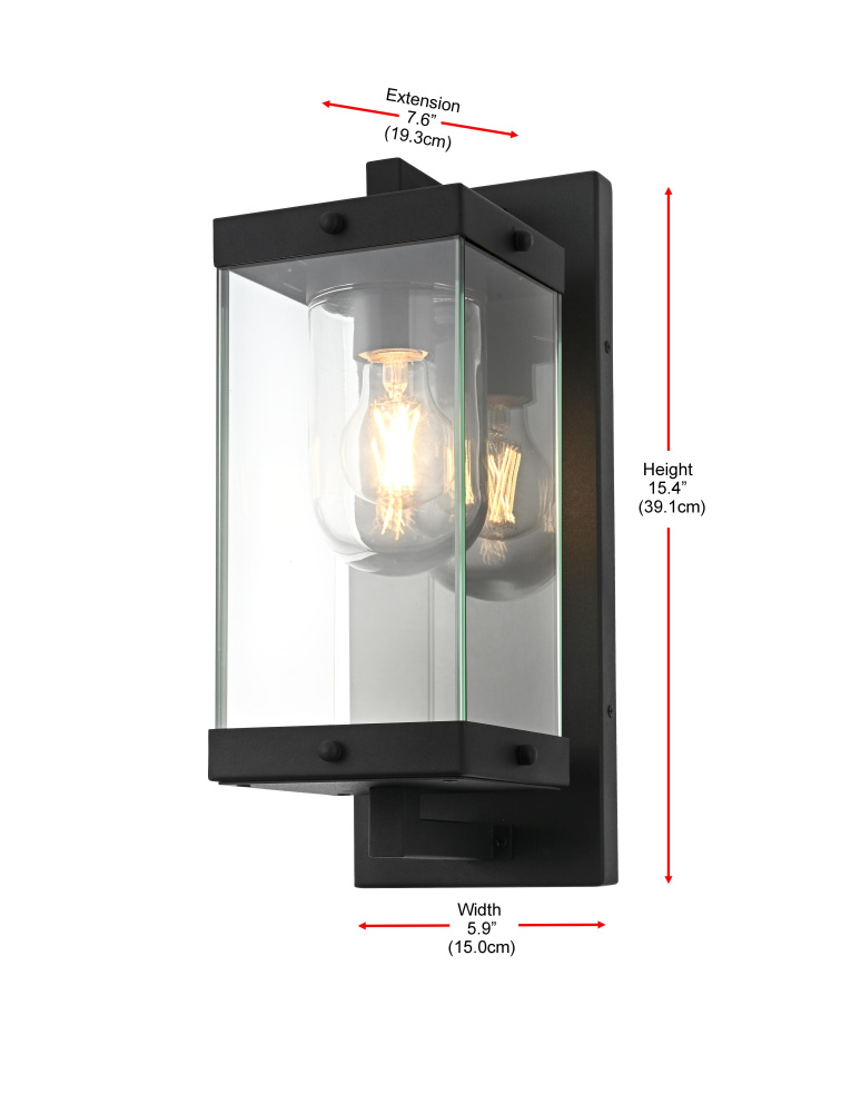Create a sophisticated and welcoming outdoor ambiance with this sleek, modern lantern-style wall light. The striking rectangular iron frame, finished in a deep matte black, houses a unique dual-glass design—featuring a clear cylindrical shade within a larger glass enclosure for a layered and dimensional look. This design not only enhances the light’s depth but also showcases the beauty of an exposed filament bulb (not included). A floating arm detail adds an elegant architectural element, while the enclosed bottom, secured with screws, ensures durability against the elements. Perfect for patios, entryways, and exterior walls, this wet-rated lantern is designed for long-lasting style and performance. Pair it with your preferred E26 bulb to create a warm and inviting glow that enhances your outdoor space with refined sophisticat