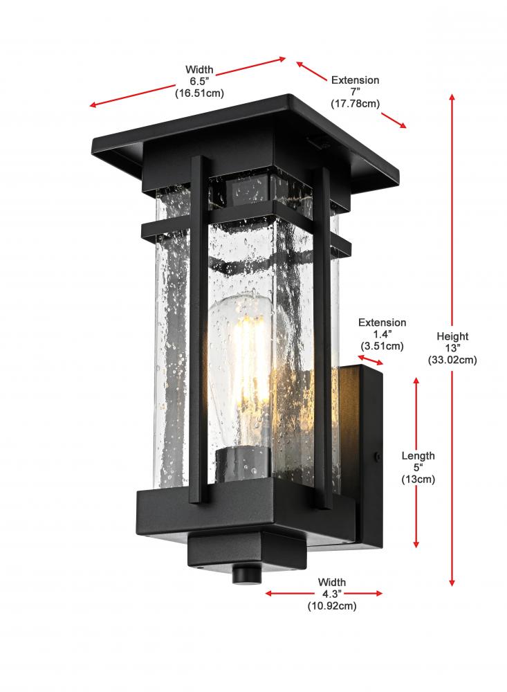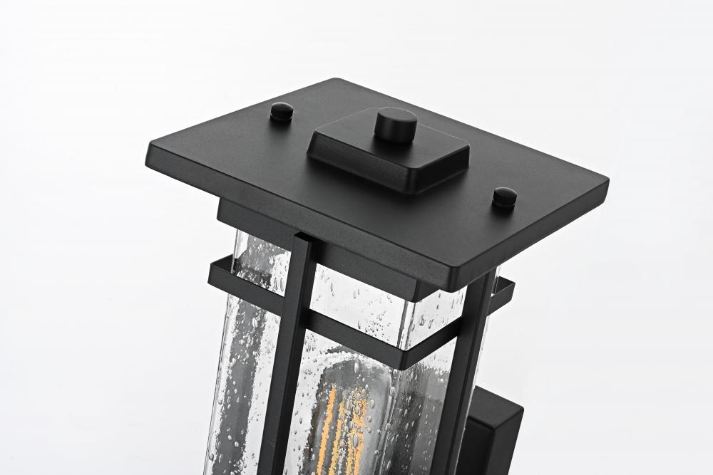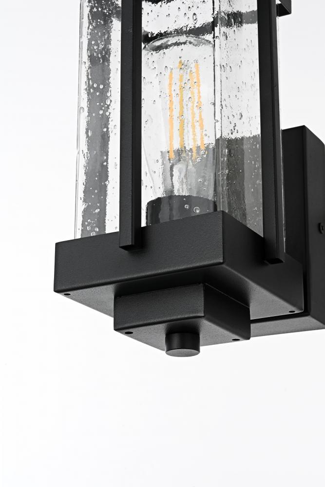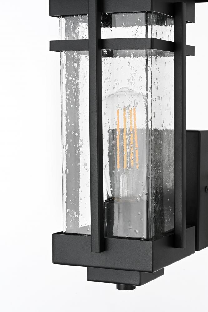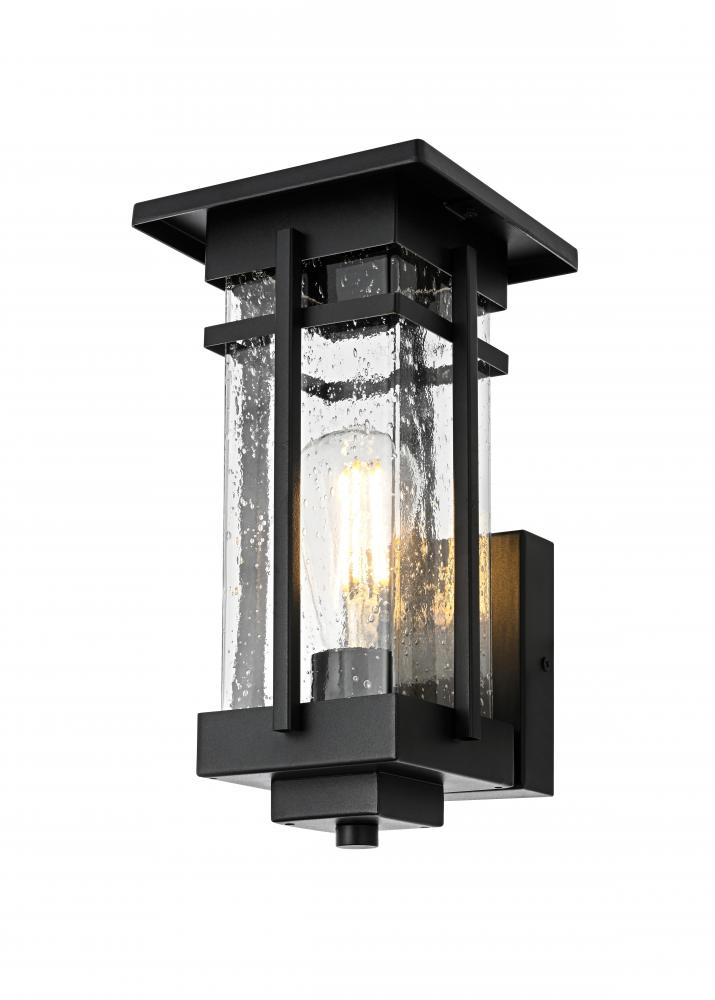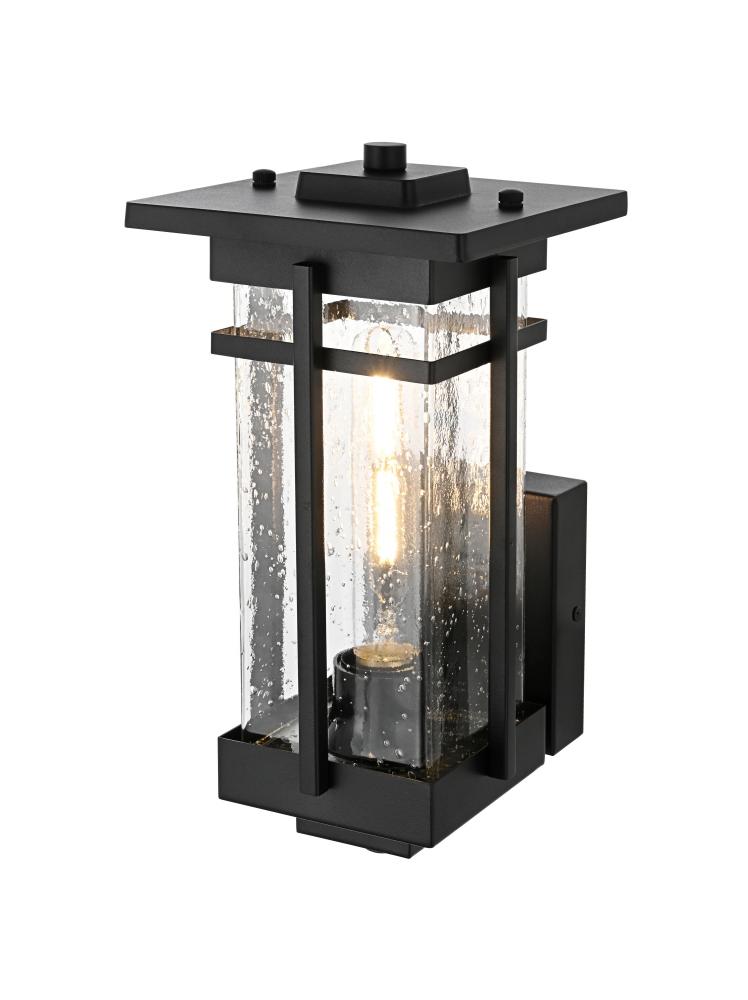 This outdoor wall sconce is a perfect blend of durability and style, making it a standout piece for any exterior wall. Crafted from high-quality iron and clear seeded glass, the sconce exhibits a timeless lantern silhouette with crisp lines and an attention to detail that provides a fresh twist on classic outdoor lighting. The iron frame with a sleek black finish adds a robust and contemporary touch, while the clear seeded glass creates a warm and inviting glow, enhancing the overall ambiance of any outdoor space. Featuring an E26 base for versatile bulb options, this light is as functional as it is beautiful.
