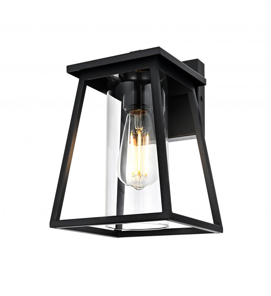 This outdoor wall sconce offers a seamless combination of clean lines and modern styling that makes it an ideal choice for adding character and warmth to any exterior. Made of durable iron with clear glass panels, it frames the light beautifully, allowing it to illuminate your home's exterior with a welcoming glow. The trapezoid frame, open bottom, and minimalist silhouette contribute to a contemporary look that blends well with both modern and transitional outdoor settings. The E26 socket accommodates a wide variety of bulbs, making it customizable to fit your lighting needs, while the triangular loop accent on top adds a charming architectural detail. Perfect for patios, porches, or entryways, this sconce enhances your home's curb appeal and provides practical lighting for any outdoor space.