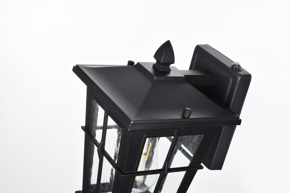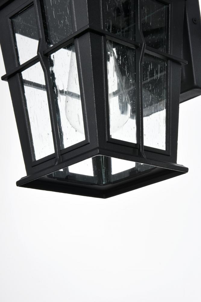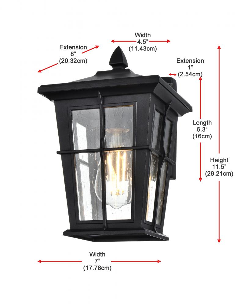 This outdoor wall sconce is a striking blend of classic craftsmanship and contemporary functionality. Crafted from durable aluminum and encased with clear seeded glass, this sconce is both aesthetically pleasing and highly functional. The lantern-style design, featuring a cross-hatch metal framework and peaked roof, brings a timeless charm to your home's exterior. The seeded glass panels create a lovely diffusion of light, providing a warm and welcoming ambiance. The built-in dusk to dawn sensor adds convenience, automatically lighting up your space as night falls and saving energy during daylight hours. with an E26 socket base, this sconce allows for versatile bulb options, adding further to its adaptable design. This sconce seamlessly blends with various architectural styles, making it perfect for any outdoor area—from the front porch to backyard patios.