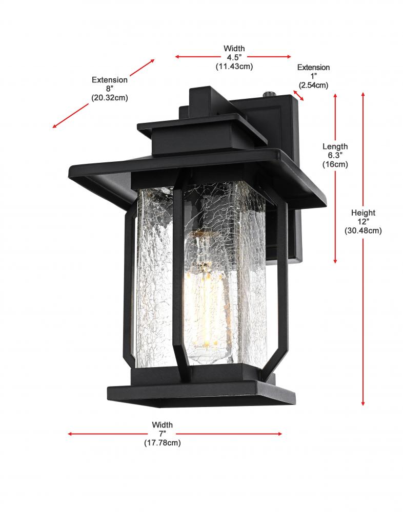 Transform your home's exterior with this charming craftsman-style wall sconce. Built with a durable iron frame and finished in a sleek matte black, this sconce adds character to your entryways, patios, or porches. The crackle glass panels create a unique, diffused lighting effect, giving your home a warm and welcoming glow. Featuring a dusk to dawn sensor, this light automatically adjusts to provide illumination exactly when you need it, offering both convenience and energy savings. Designed to endure outdoor conditions, this wall sconce is both a stylish and practical addition to your outdoor space, ensuring a well-lit, safe, and attractive home environment.