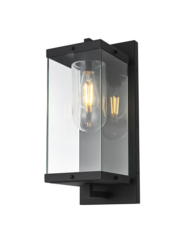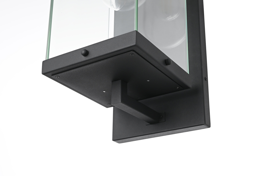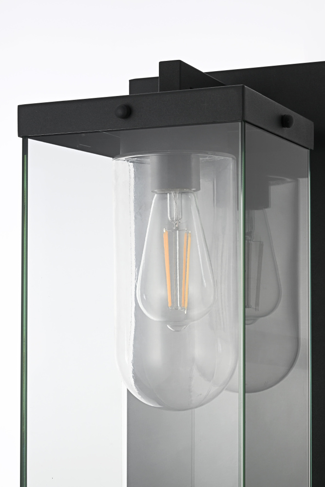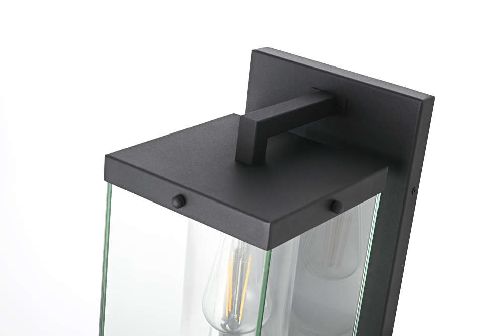 Create a sophisticated and welcoming outdoor ambiance with this sleek, modern lantern-style wall light. The striking rectangular iron frame, finished in a deep matte black, houses a unique dual-glass design—featuring a clear cylindrical shade within a larger glass enclosure for a layered and dimensional look. This design not only enhances the light’s depth but also showcases the beauty of an exposed filament bulb (not included). A floating arm detail adds an elegant architectural element, while the enclosed bottom, secured with screws, ensures durability against the elements. Perfect for patios, entryways, and exterior walls, this wet-rated lantern is designed for long-lasting style and performance. Pair it with your preferred E26 bulb to create a warm and inviting glow that enhances your outdoor space with refined sophisticat