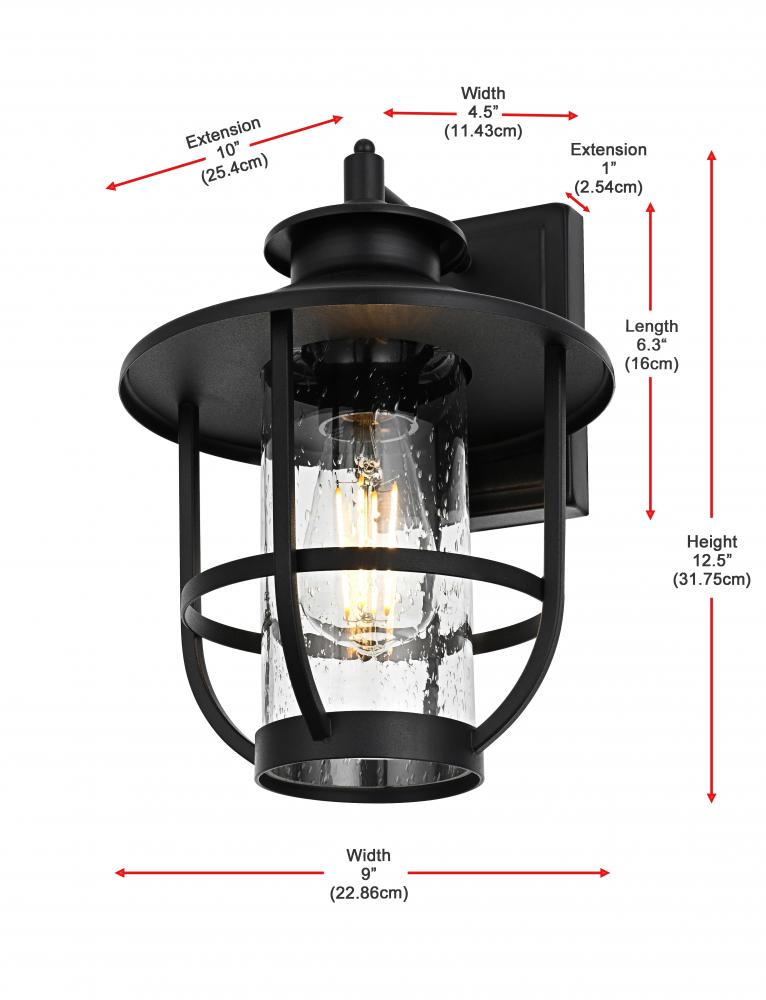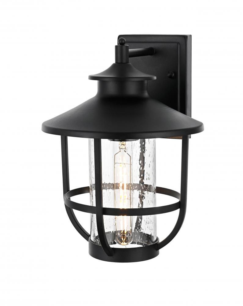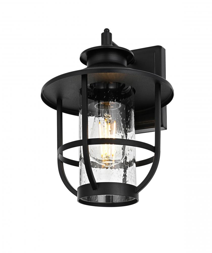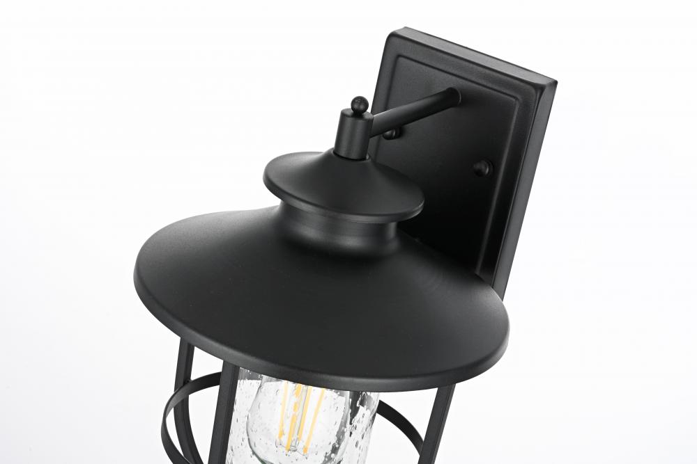 Add character and warmth to your outdoor space with this beautifully crafted iron and glass wall sconce. The sleek black iron frame holds a clear seeded glass shade that provides a rustic yet modern charm, while also ensuring maximum illumination for your entrance, porch, or patio. The fixture has a broad metal hat shade that directs light downwards, creating a comforting atmosphere while adding a touch of industrial flair. Designed to endure all types of weather, this wall sconce is made to last and maintain its beauty for years to come. It blends traditional and contemporary styles, making it versatile for almost any home exterior. The iron framework wraps around the glass for added visual interest, while the seeded glass creates a stunning glow, turning your entryway into a welcoming beacon.