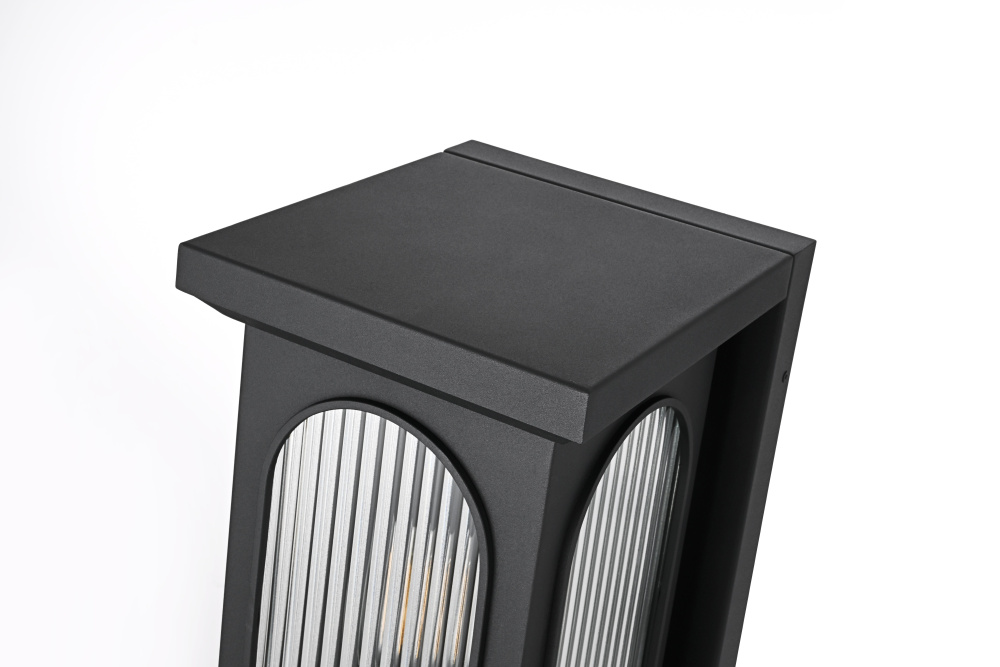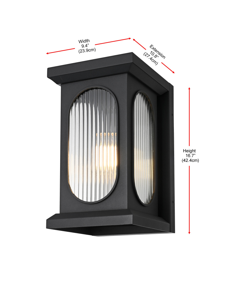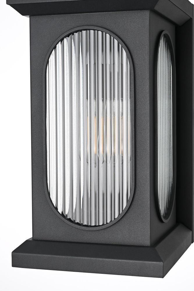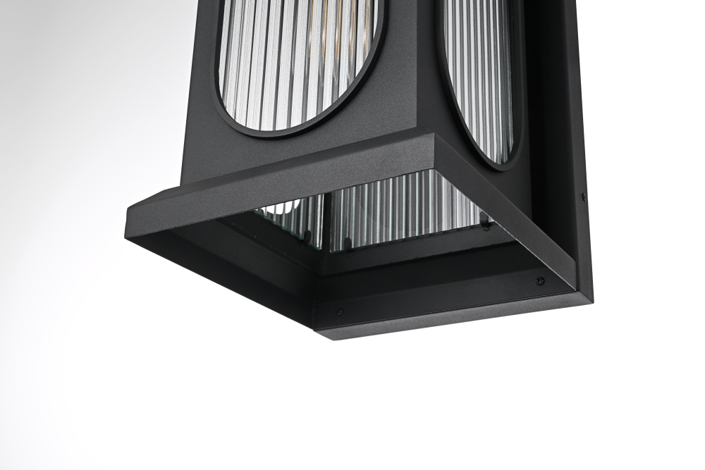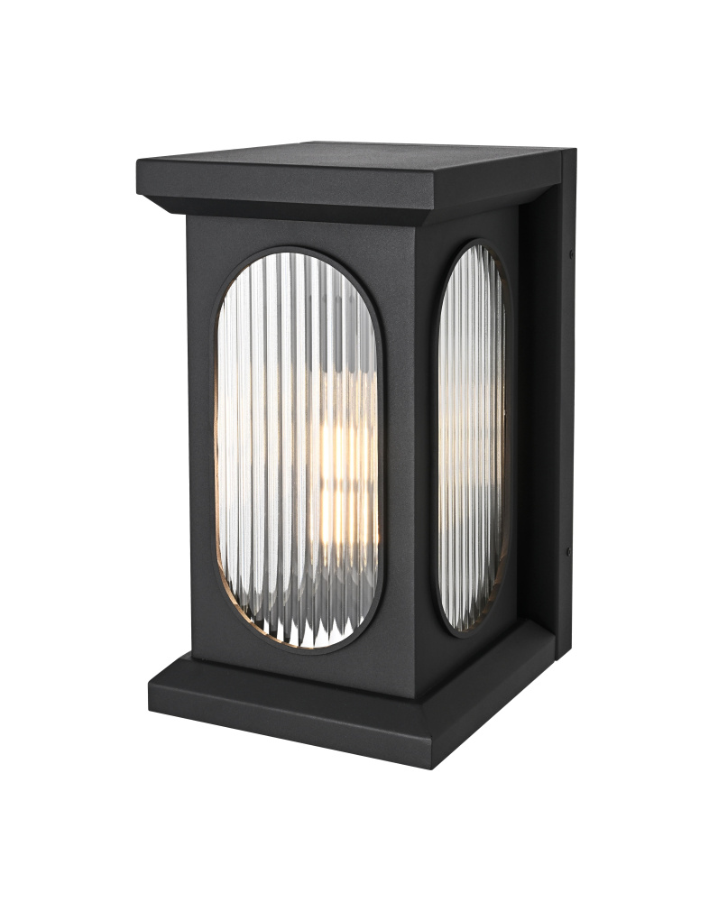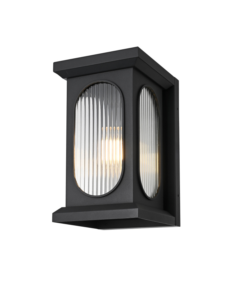 Make a bold statement with an outdoor wall light that combines structured lines with rich texture. A sturdy rectangular frame, finished in deep matte black, surrounds striking clear fluted glass panels that create a glowing, rippled effect when illuminated. The curved oval inserts soften the geometric shape, offering a balanced mix of bold structure and subtle detailing. With an enclosed bottom for a refined finish, this wet-rated wall light is built to endure outdoor conditions while maintaining its standout appeal. Designed with an E26 socket (bulb not included), it pairs effortlessly with vintage Edison bulbs for a warm glow or LED options for energy efficiency. Whether framing a front door, lighting up a patio, or brightening a side entry, this standout piece blends texture and form for a captivating outdoor look.