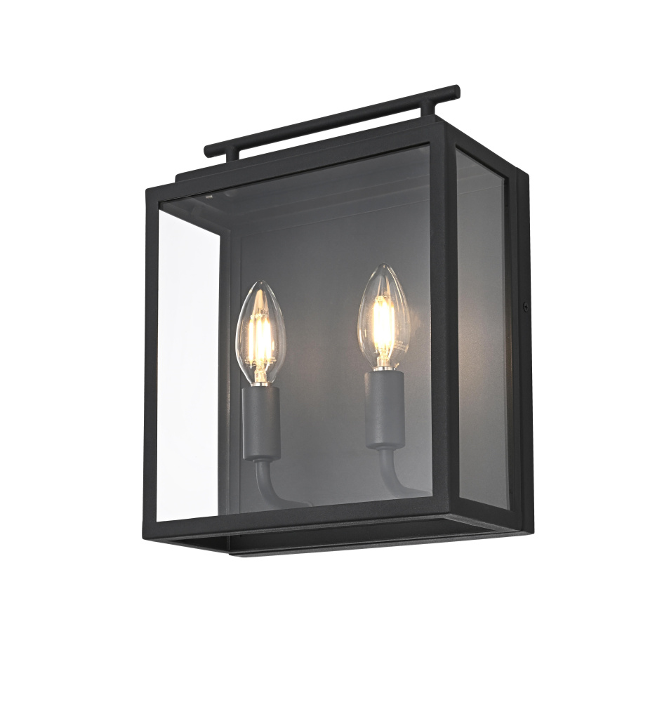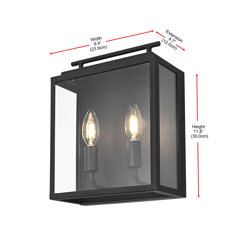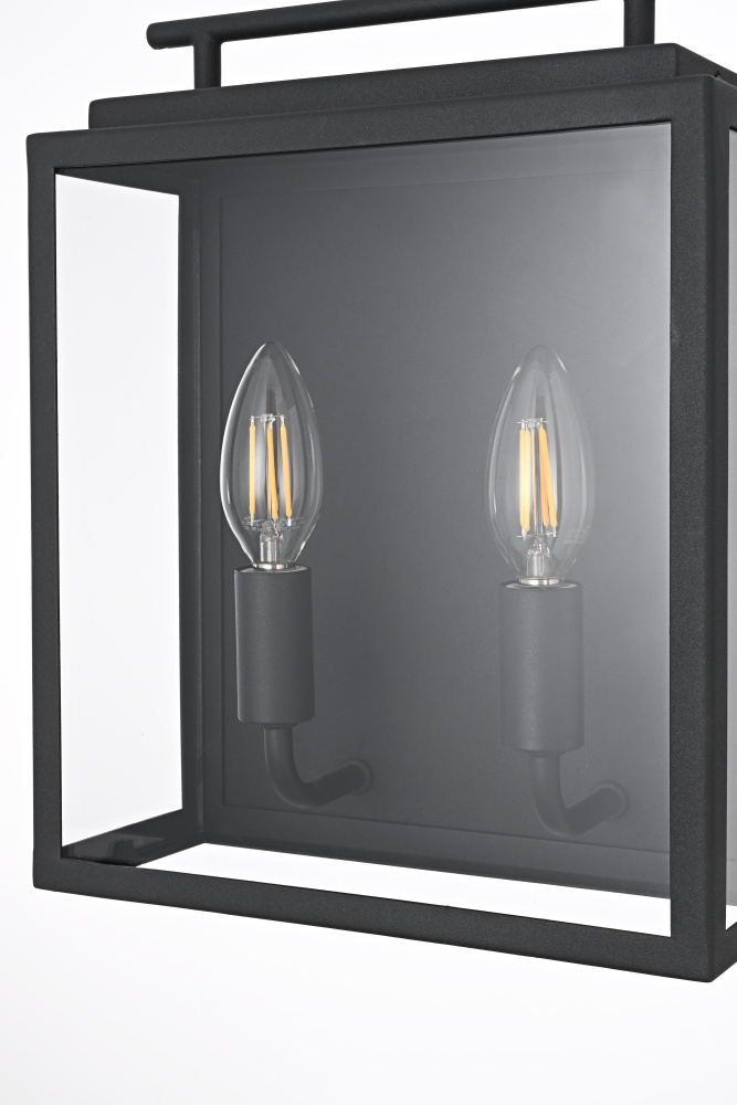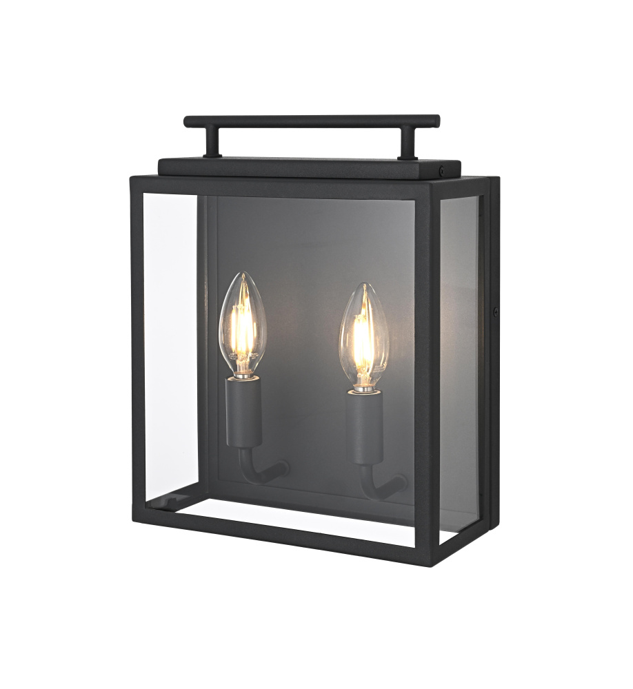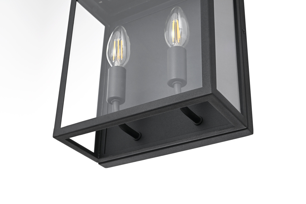 Enhance outdoor spaces with a wall light that blends sharp geometry with practical design. A structured rectangular iron frame, finished in matte black, surrounds crystal-clear glass panels that showcase the bulb in its full glow. A distinctive floating handle detail at the top adds a subtle industrial touch, while the open-bottom construction ensures easy bulb replacement and efficient downward lighting. Designed with two E26 sockets (bulb not included), this wet-rated wall light is built to endure outdoor elements, making it a perfect choice for patios, garage exteriors, and entryways. Whether paired with a vintage Edison bulb for a classic touch or a bright LED for maximum efficiency, this versatile lighting piece adds both style and function to any exterior setting.