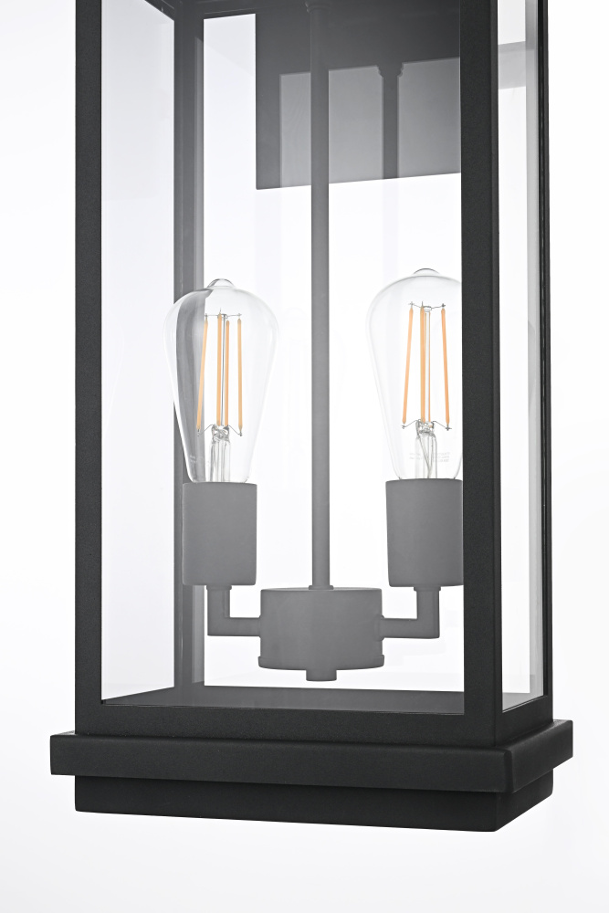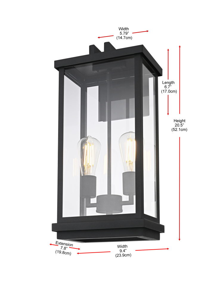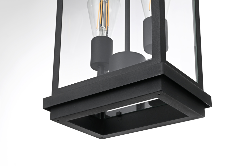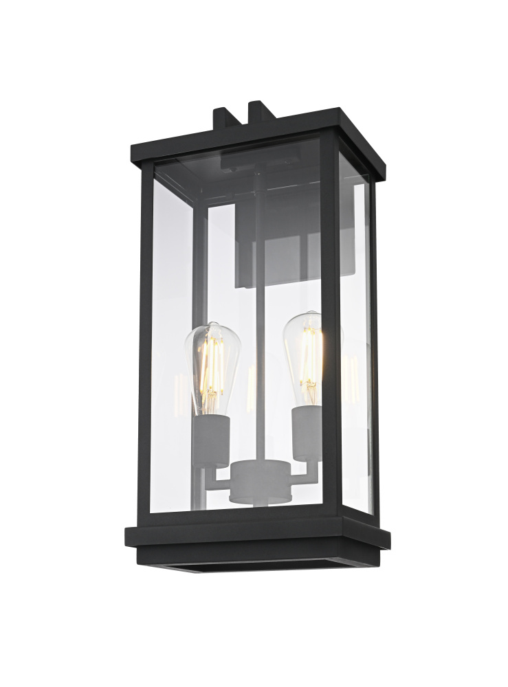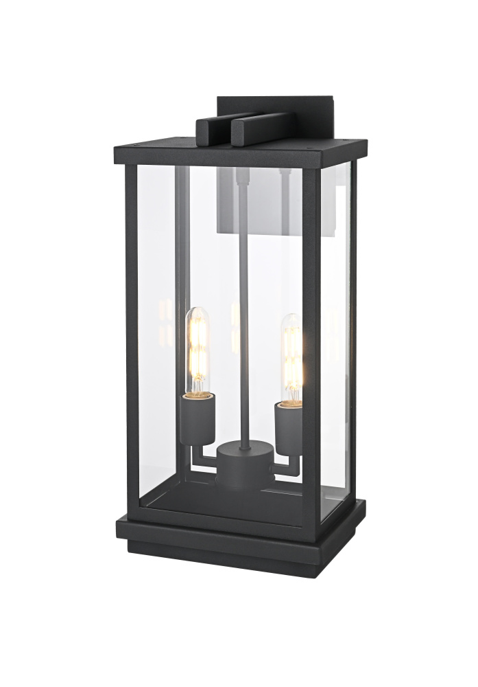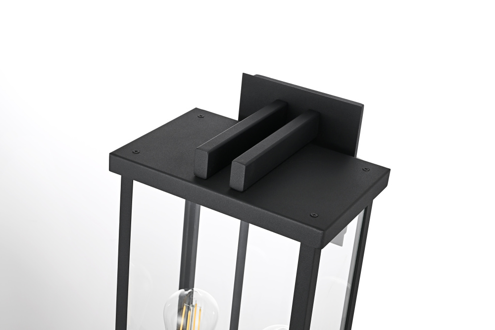 Bring structured elegance to your outdoor space with this bold and modern wall light. Featuring a crisp rectangular iron frame with clear glass panels, this fixture delivers a sleek, architectural presence while ensuring bright, unobstructed illumination. Designed with two E26 sockets (bulbs not included), it provides a balanced and inviting glow perfect for entryways, patios, or porches. The open-bottom frame allows for easy maintenance while enhancing the overall clean-lined aesthetic. A floating mount with layered detailing adds depth to the design, making it a striking focal point for any modern exterior. Built to withstand the elements with its wet-rated construction, this fixture offers both durability and contemporary style, making it an essential addition to your outdoor lighting collection.