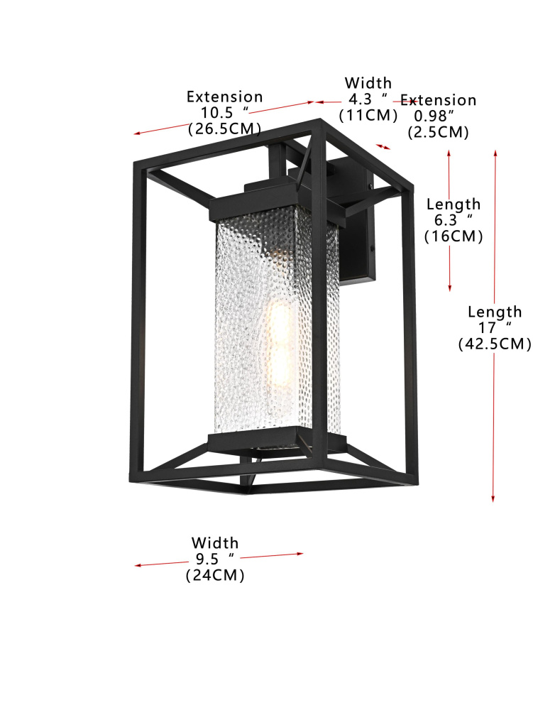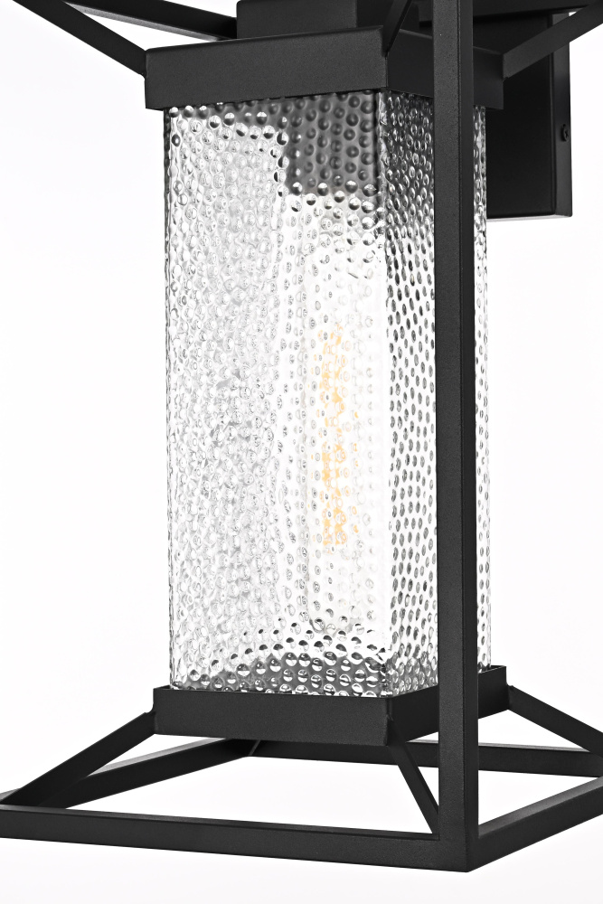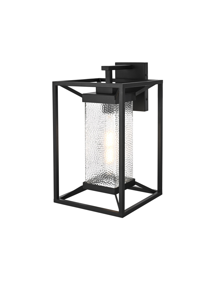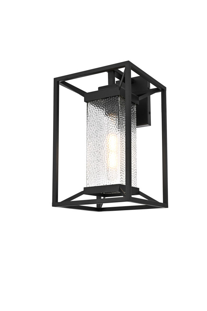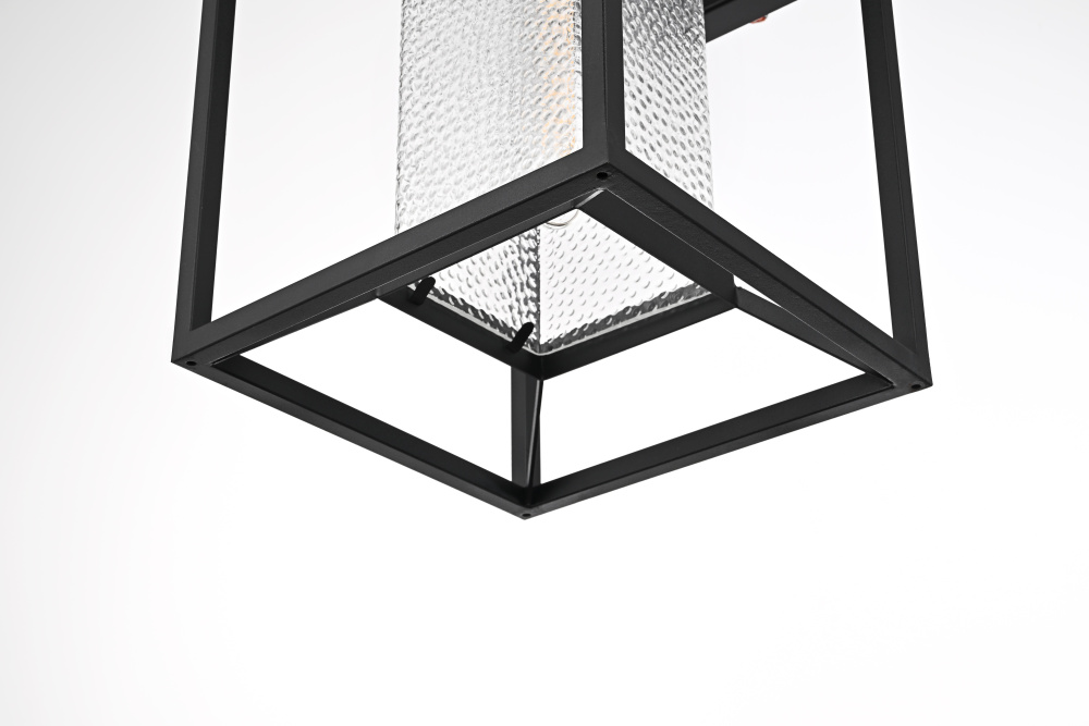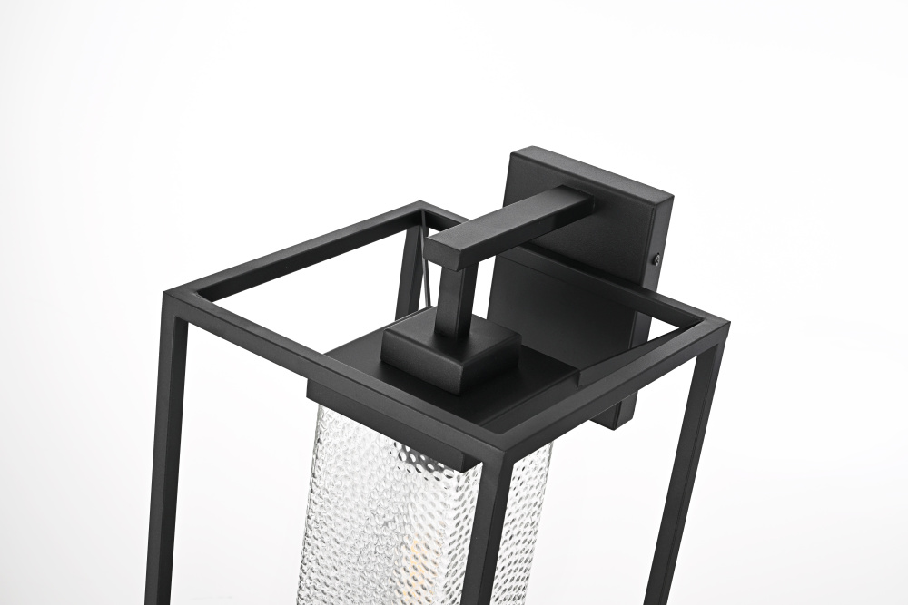 This outdoor wall sconce blends modern simplicity with timeless charm. The sturdy iron frame is designed in a geometric shape, beautifully housing the clear seeded glass that allows the warm glow of the light to shine through. The clear seeded glass adds texture to the illumination, creating an inviting and sophisticated glow that transforms the exterior of your home. With an E26 socket base that easily accommodates standard bulbs, this fixture not only provides style but also high functionality. Whether flanking your front door or lighting up your patio, this sconce elevates your outdoor space with a crisp, contemporary look that is both durable and refined.