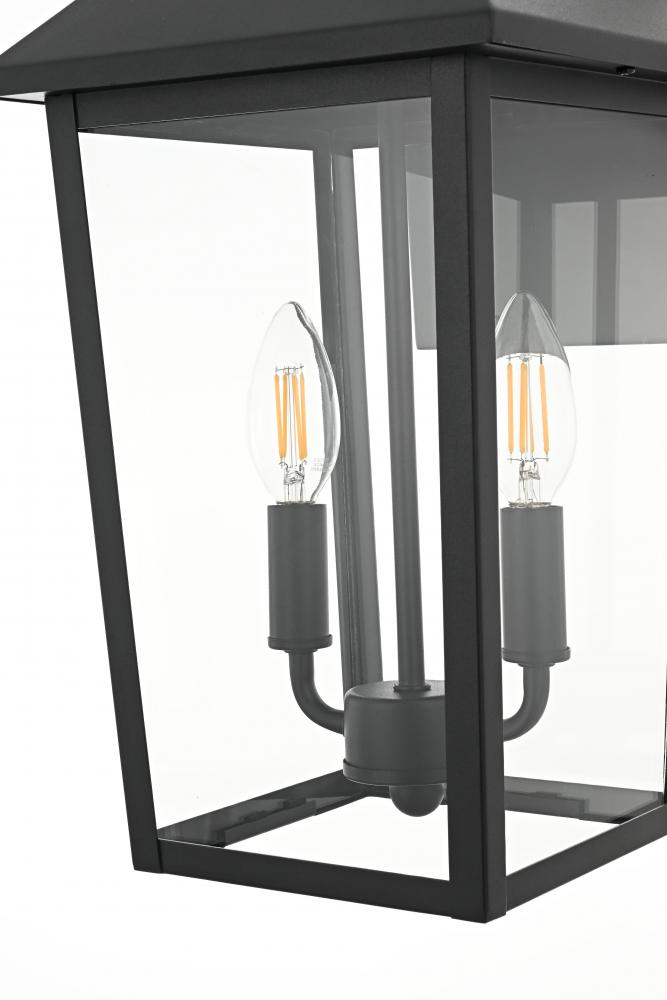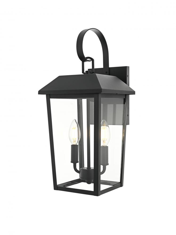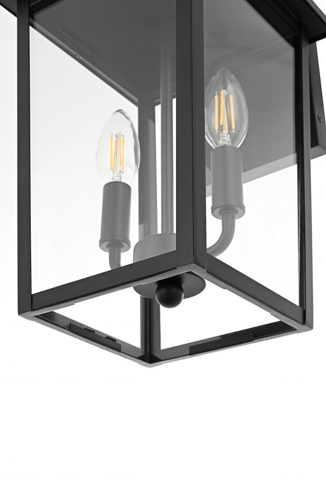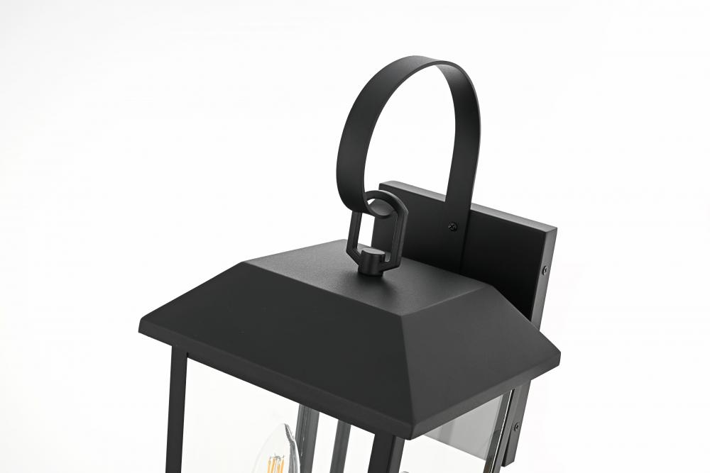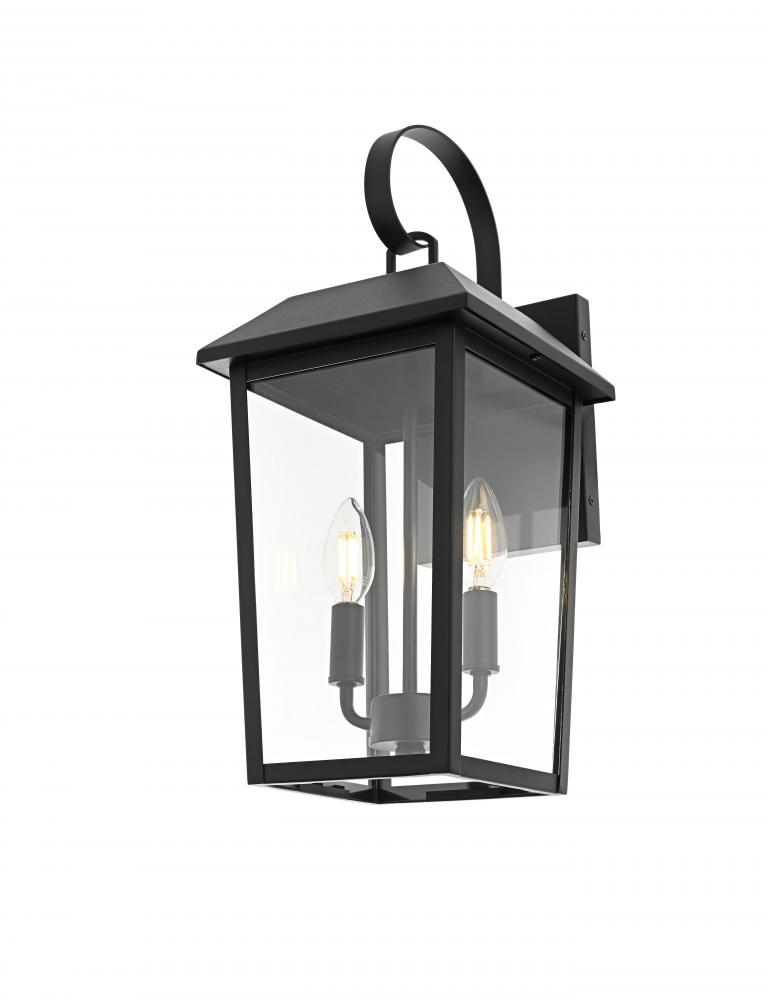 Enhance your home’s curb appeal with this striking outdoor wall sconce. Crafted from sturdy iron and framed with crystal-clear glass, this sconce embodies a bold rectangular lantern design that radiates classic charm. with two candelabra-style bulbs, it casts a warm, inviting glow, beautifully amplified by the clear glass panels. The matte black finish and curved arm detail add a touch of architectural refinement, while its weather-resistant design ensures lasting beauty. Perfect for entrances, patios, or walkways, this sconce lights the way in style.