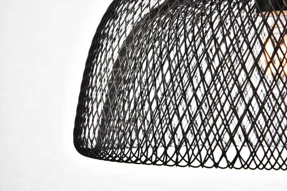 Complex woven lattice of iron wires and narrow hanging cable in a matte-black finish