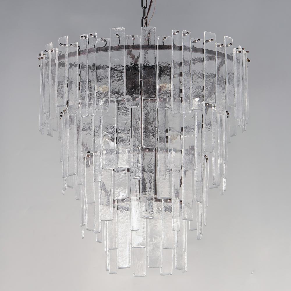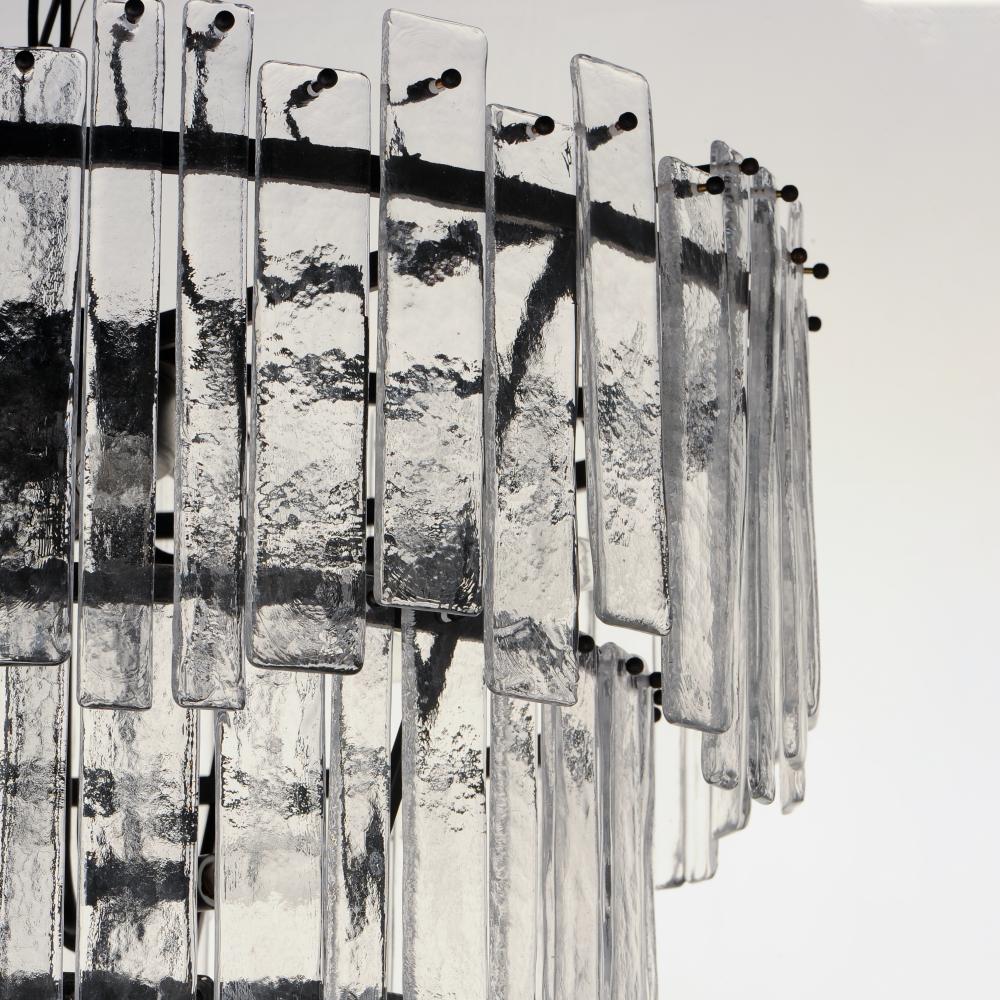 Gracefully flowing molten glass panels with uniquely organic aesthetic encircle rings of rich Darkened Bronze metal or hand-applied Gold Leaf. This refined interpretation of tiered glass pendants exudes warmth and elegance, effortlessly blending a moody am
