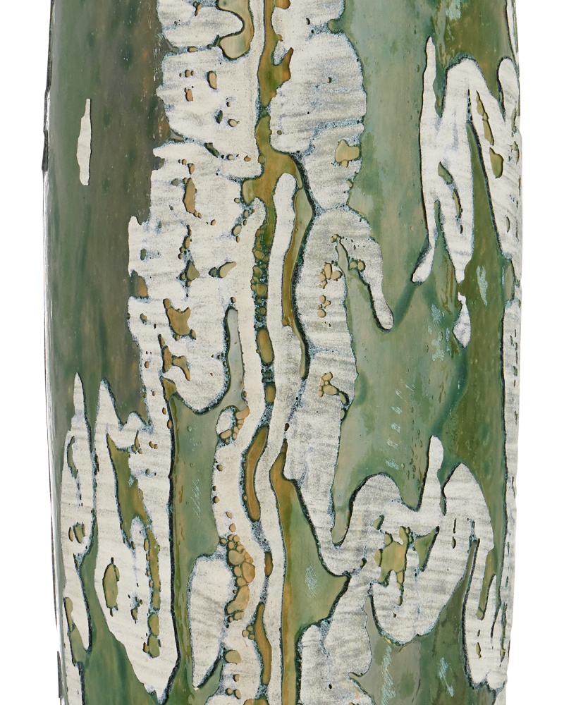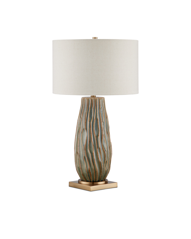 The Water-borne Table Lamp, with its flowing peaks and valleys, looks like a gushing stream in the springtime. Made of ceramic, the artful composition is covered in a forest reactive glaze with green hues filling the valleys and tan tones enlivening its peaks. The green lamp rises from a metal base in an antique brass finish and a matching finial fastens the drum shade to the fixture.