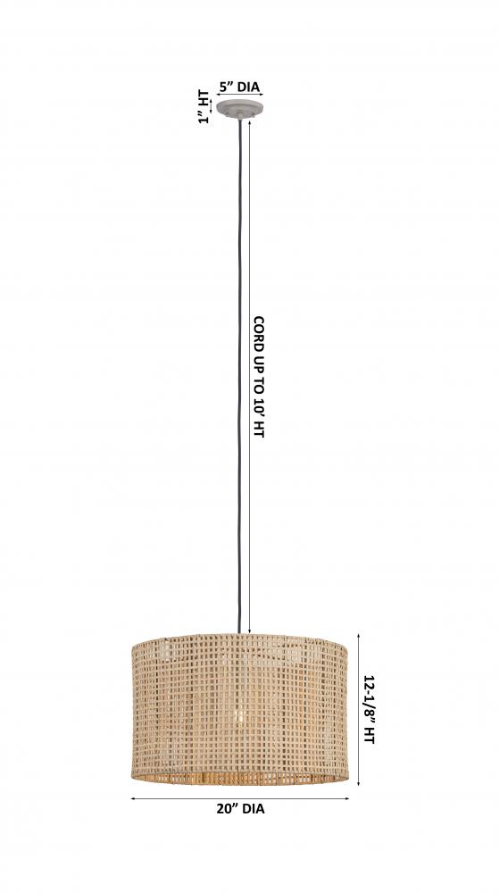 This modern drum pendant features a natural woven rattan shade, adding organic warmth to any space. Each piece is uniquely crafted with slight variations in the weave pattern, creating an individual statement of natural beauty.