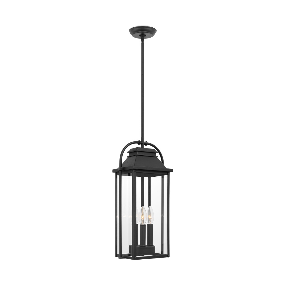 Designed by Sean Lavin, the Wellsworth three-light outdoor pendant fixture in textured black enhances the beauty of your property, makes your home safer and more secure, and increases the number of pleasurable hours you spend outdoors. A subtle interplay of traditional design elements and nautical influences creates the charming visual approach to the Wellsworth outdoor collection by Visual Comfort Studio. Available in three finishes and two different aesthetics. Antique Bronze finish paired with Clear Seeded glass creates a more traditional look to these outdoor light fixtures, while Burnished Brass and Painted Brushed Steel finish and Clear glass reflect a more contemporary approach. The Wellsworth collection includes a 3-light outdoor pendant, a 3-light outdoor post lantern, and 3-light small and medium outdoor lanterns, as well as a 4-light large outdoor lantern. Cast aluminum construction ensures durability. Damp Rated.