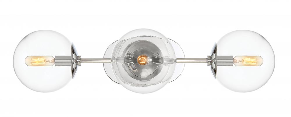 Distinctly on-trend and timeless today, with a nod to classic and mid-century modern design of the past. With its bright chrome finish and unique accents, this 3-light bath bar will be the star of your bathroom. The clear glass shades highlight the vintage bulbs. These bathroom lights are designed for damp locations such as over sinks in bathrooms and vanity areas.
