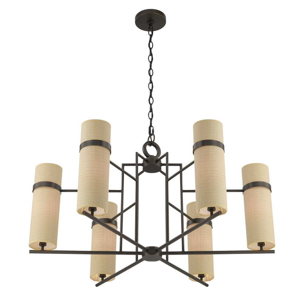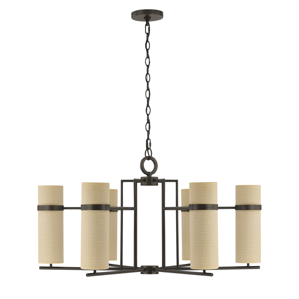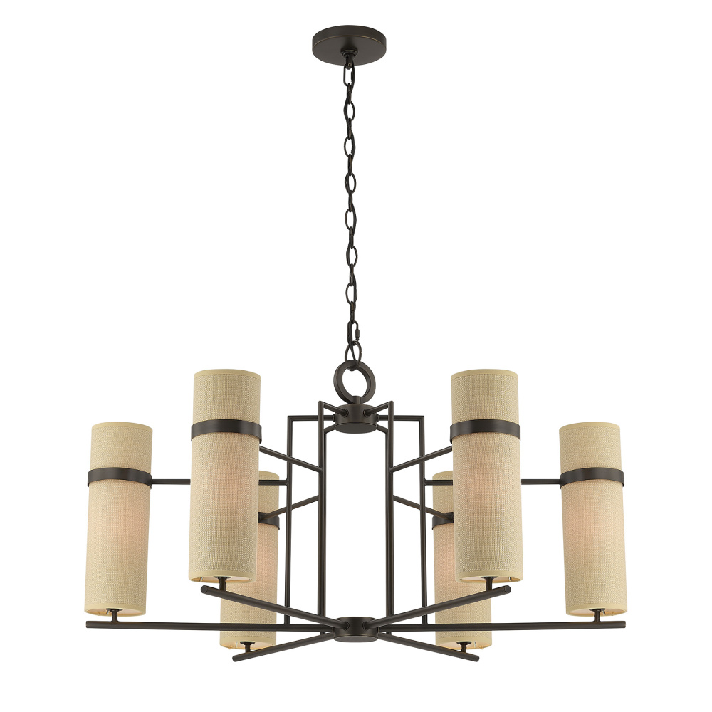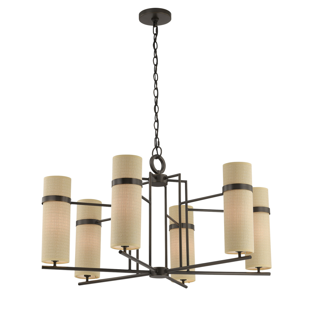 The Savoy House Weston 6-light chandelier, designed by award-winning interior designer Dann Foley, showcases generous scale and graceful symmetry. Slim, vertically textured beige fabric shades glow softly against the Mediterranean Bronze finish, giving the fixture a timeless yet globally influenced personality. Weston measures 17.25" in height and 34" in width. It uses six candelabra size bulbs of up to 60 watts per bulb. Bulbs not included. Includes 120" of chain to allow for tailored installation.