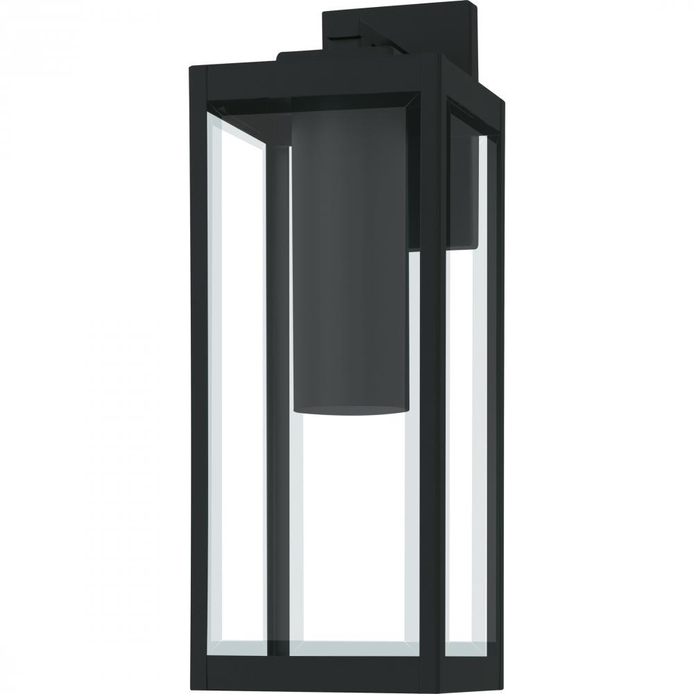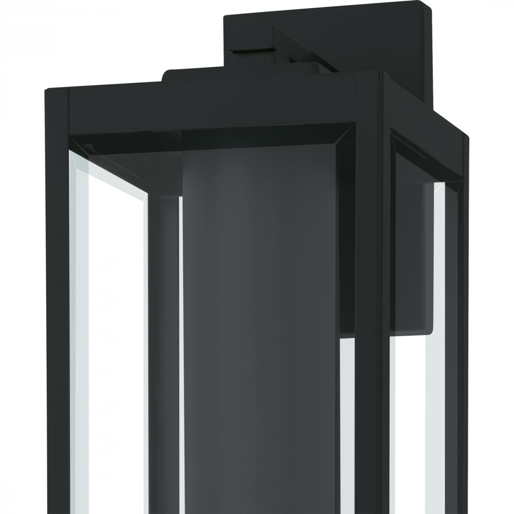 The clean lines and hand-riveted accents make the Westover outdoor wall lantern a modern industrialists dream. A long rectangular framework provides an unobstructed view of the lanterns sleek interior, highlighted by an earth black finish and clear beveled