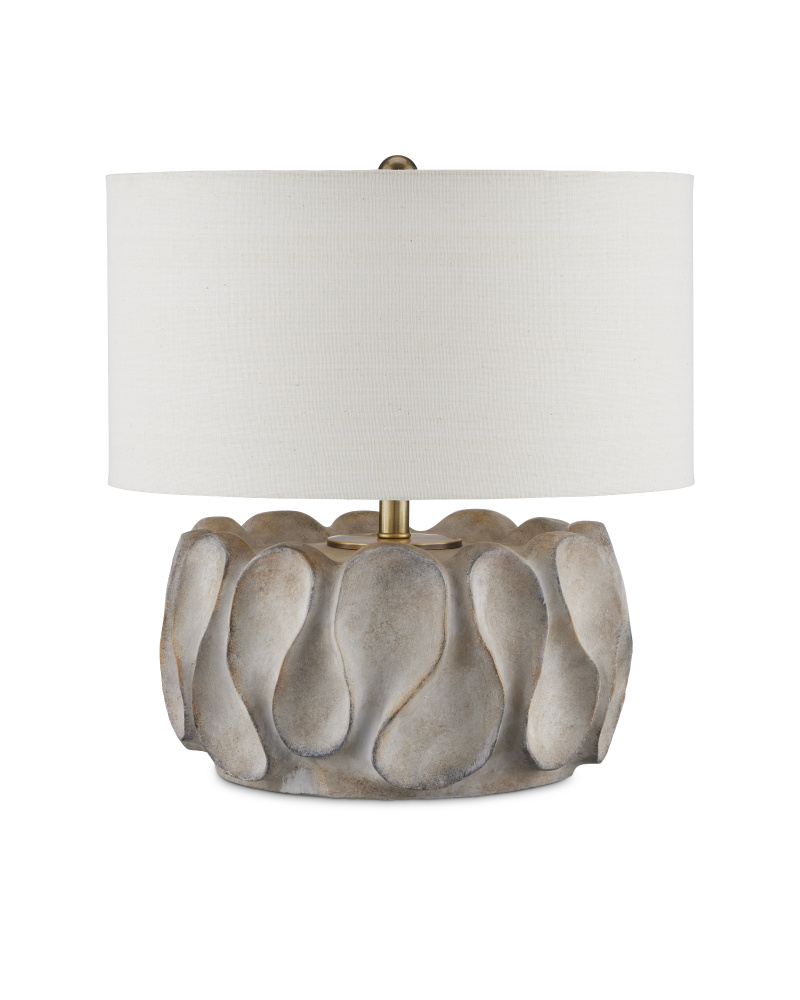 The Weststrand Table Lamp has a flowing shape packed with personality. The spoon-like swells pressed into cast concrete create an artistic statement because they are far from uniform, which adds interest to the squashed shape of the rugged-looking gray lamp. The surface has a wonderful texture to it, and the light antique brass finish on the hardware draws out similar tones along the surface of the cement.
