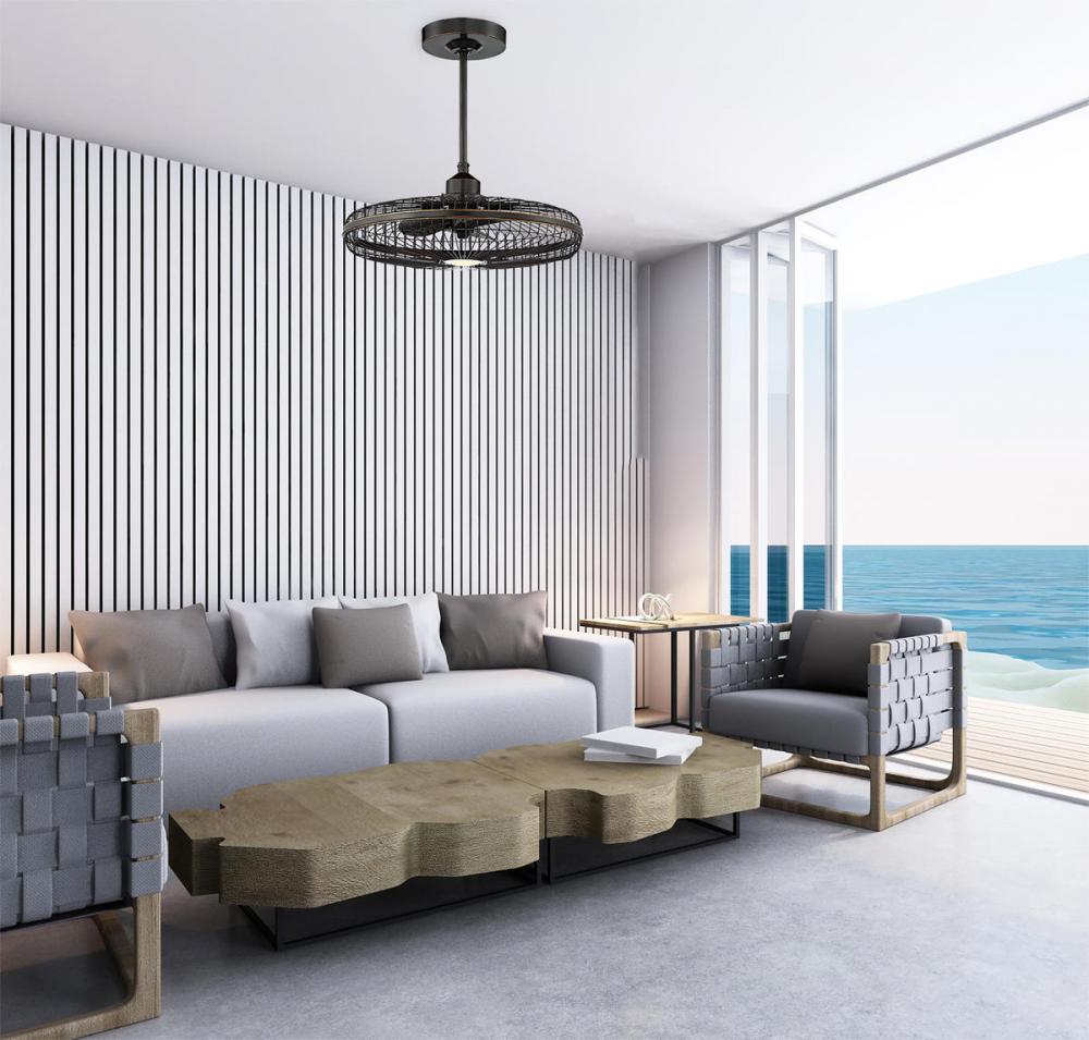 The Wetherby has a stylish, vintage look thanks to it’s classic cage frame. This fan d’lier features an inner ceiling fan with 14” blade span, and an integrated light, for both illumination and air comfort. The 29” wide fixture has a terrific, classic bronze finish with black fan blades. And a white etched glass shade covers the included 12W dimmable LED bulb (800 lumens, 3000K). A handheld remote is also included, with three-speed fan control and independent light control —for easy light and airflow adjustments. This fan d’lier is UL rated for damp locations so it may be installed indoors, in your dining room, kitchen, living room, office, or family room, as well as in covered outdoor areas, such as your porch, garage, workshop, or sunroom.