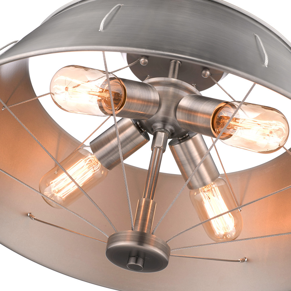 Perfect for rustic, industrial, or loft-like interiors, Whitaker is a series of modern, rustic fixtures. Simple lamps are partially hidden by oversized shades. The plated metal shades are pierced by industrial cables. The aircraft cables combine form with function connecting the fixture bodies to the shades and center columns. The collection features a matte Aged Steel finish that is dark and industrial. This semi-flush creates a generous open area for widespread ambient lighting.