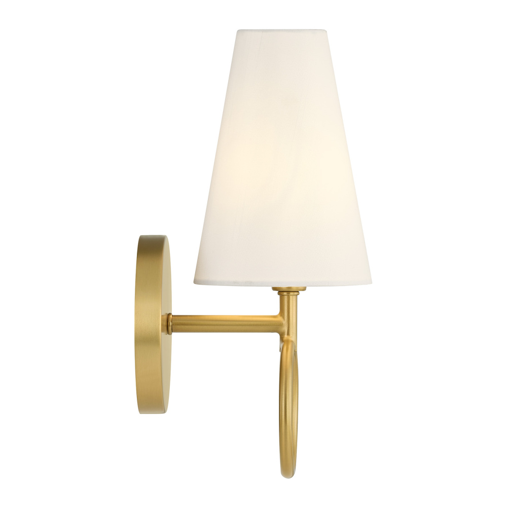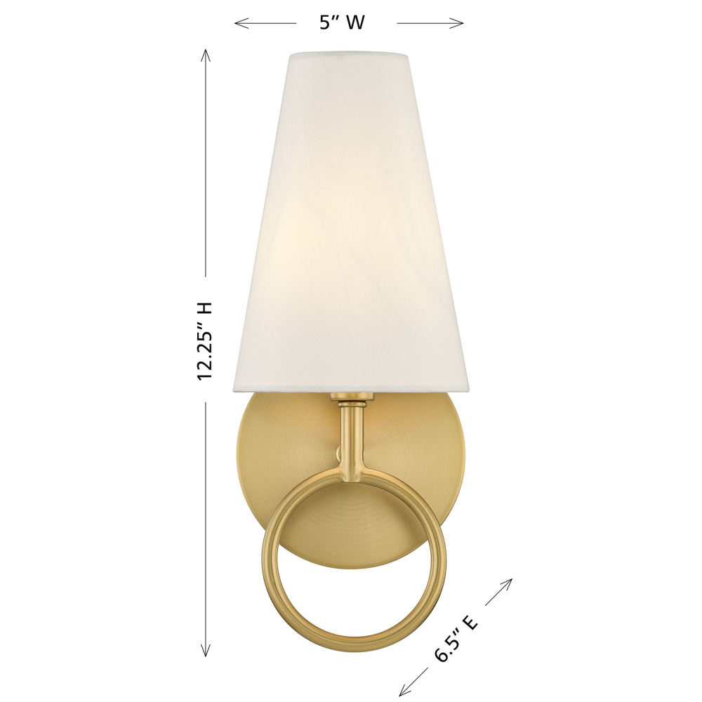 The Savoy House Wilkes 1-light sconce, designed by award-winning interior designer Dann Foley, brings graceful sophistication to any wall. A ring finished in Warm Brass frames the backplate, echoing the classic silhouette of the conical white fabric shade. The result is a quiet, tailored glow that elevates hallways, bedrooms, and more. Wilkes is 12.25" in height, 5" in width and extends 6.5" from the wall. It uses one candelabra size bulb of up to 60 watts. Bulb not included. Damp area rated.