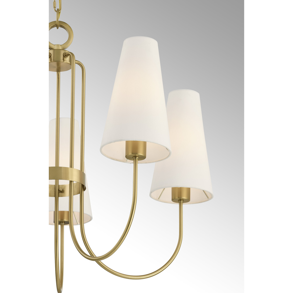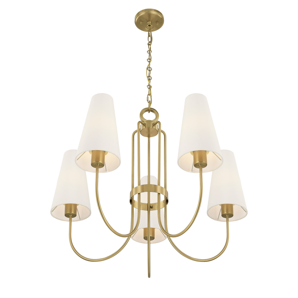 The Savoy House Wilkes 5-light chandelier, a design from award-winning interior design Dann Foley, brings refined structure to entryways, dining rooms, and living spaces. Its Warm Brass finished arms curve gracefully, each topped with a crisp white fabric shade that delivers a timeless, softly glowing look. Wilkes is 24" in height and 30" in width. It uses five standard size bulbs of up to 60 watts per bulb. Bulbs not included. Comes with 120" of chain.
