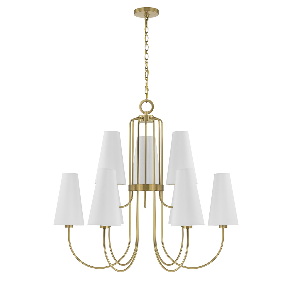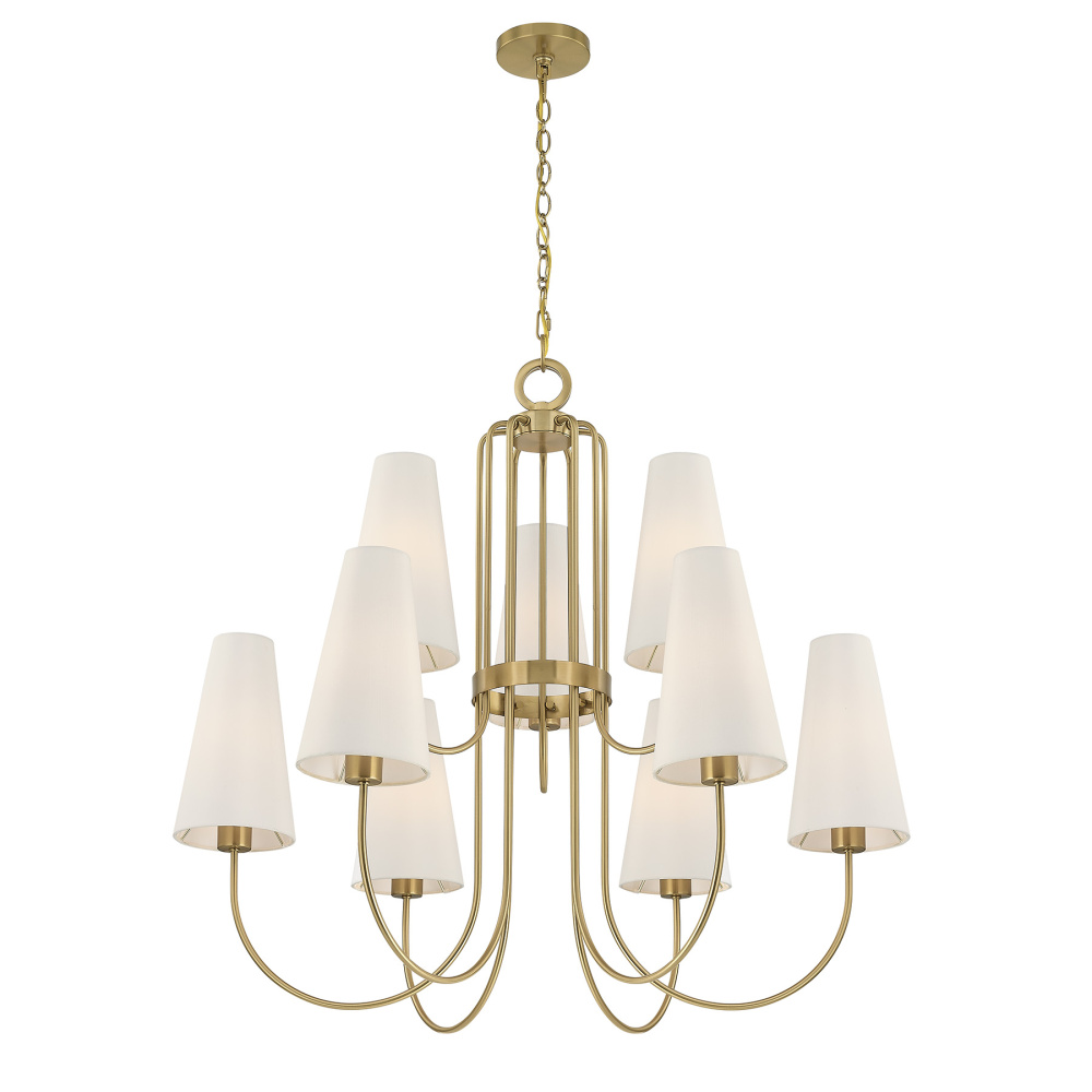 The Savoy House Wilkes 9-light chandelier, designed by award-winning interior designer Dann Foley, offers sweeping elegance for larger rooms seeking a refined New Traditional touch. Slim, gently arched arms in Warm Brass radiate outward, each supporting a beautifully tailored white fabric shade that diffuses a warm, inviting glow. Wilkes is 33" in height and 36" in width. It uses nine standard size bulbs of up to 60 watts per bulb. Bulbs not included. Comes with 120" of chain.
