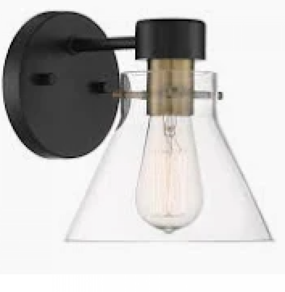 A crisp and clear blown glass shade, rich combination of finishes and an airy design work to create the striking simplicity found in this Willow Creek wall sconce. The shape of the glass gives a nod to a Modern Industrial interpretation but the overall clean appeal makes this fixture a perfect compliment to virtually any interior. The fixture is easy to install and requires 1 screw-based light bulb, ideal for filament style.
