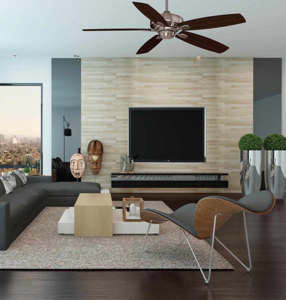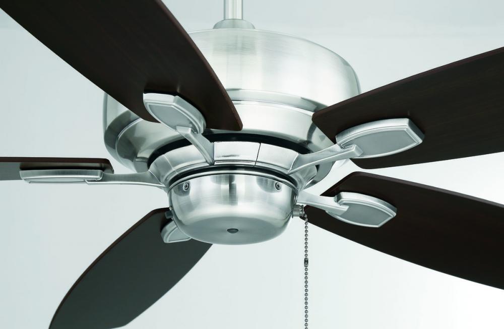 This eye-catching fan has sleek details that add the finishing touch to all of today's interiors. The lustrous Brushed Pewter finish is elegant and perfectly complemented by Chestnut and Grey Wood blades.