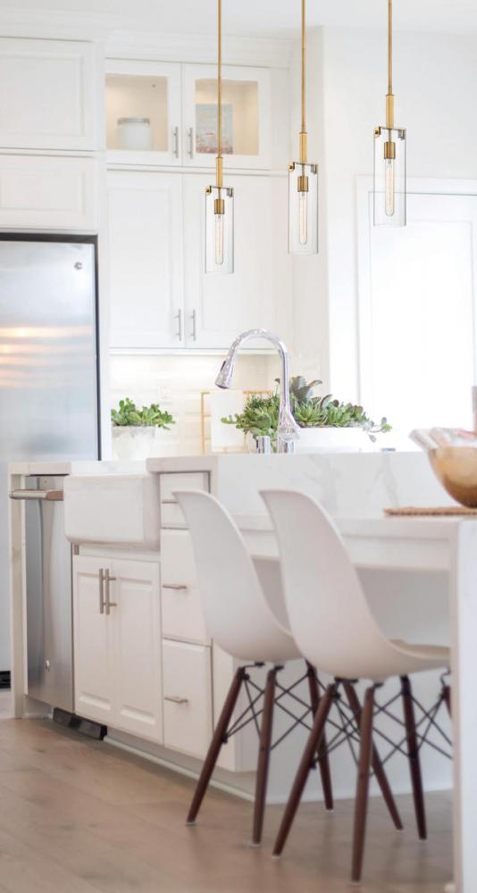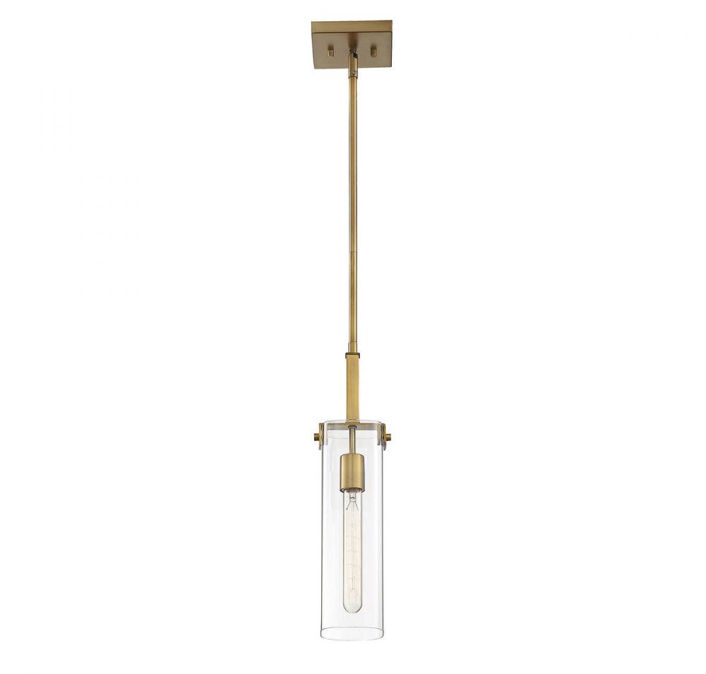This Savoy House Winfield 1-light mini pendant showcases a bold, slim look with a shade of clear glass, thoughtful minimal detailing and a warm brass finish.
